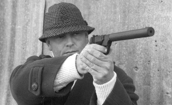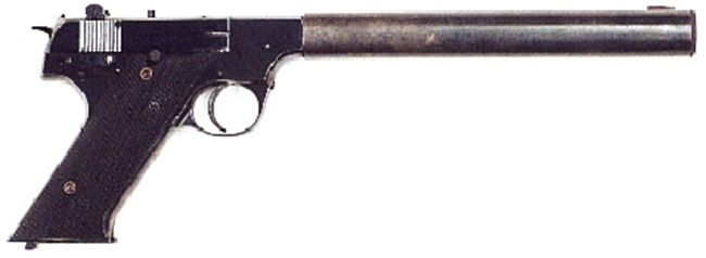 当然,一支无声枪在任何秘密行动中都可能被列为首选装备,所以在OSS成立后不久,特工们就尝试在.22 LR口径的柯尔特“森林人”(Woodsman)手枪装上仿制的马克沁式消声器来使用。这种消声器连接在枪管延长段上,消声器顶部配有条状准星,配合手枪原本的标准照门使用。枪管的延长段据称也提高了武器的精度,这种大型消声器在很大程度上降低膛口噪声,只是武器的尺寸变得太长,不太便于隐蔽携带。