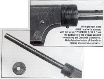 管状消声器全长7.75英寸(约197mm),直径1英寸(25.4mm)。消声器拧在从套筒上露出来的枪管上。枪管上开有4排泄气孔,每排11个,泄气孔直径为0.125英寸(3.175mm)。消声器内有多个由铜丝网卷成的圆圈,通过吸热原理使火药燃气冷却,降低气体压力。这种消声器使膛口噪声降低超过20dB,在那个时代来说,这个效果已经是相当出色了。吸热式消声器的缺点是吸热材料容易积聚火药残渣,需要经常清洗,但OSS无声手枪的消声器是设计成一次性用品,本身不能分解维护。该消声器的使用寿命估计为200发左右,不过以这种特工武器的使用特色,这样的寿命足够给一个特工平时练习和实际使用了。另外消声器本身可以从枪管上拧下来,这是为了便于维护手枪,但也方便了更换一个新的消声器。