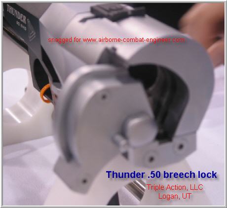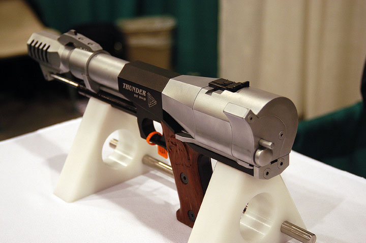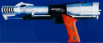 这是一支发射.50 BMG弹的手炮,名叫“雷电”(Thunder .50),由一家名叫Triple Action, LLC的公司设计,首度公开是在2004年的SHOT SHOW上。由于是在手枪上发射.50 BMG弹,因此要依赖高效的枪口制退器让射手不至于骨折,而且由于枪弹巨大,也只能做成单发枪,从后膛装弹。这个枪实在让人很感兴趣,但愿意买来玩的人也未必有几个。原本宣称将在2006年正式公布生产型,但后来连公司都没有了,样枪也不知所踪。估计这手枪实在是没有钱途,做不下去了。