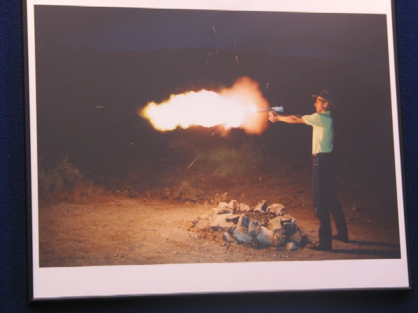 Triple Action, LLC在SHOT SHOW 2004的展台上贴出的试射照片,可以看到巨大的枪口焰