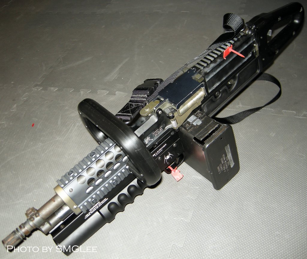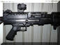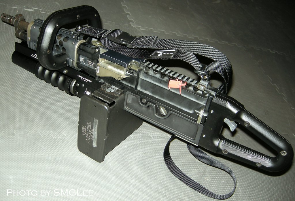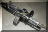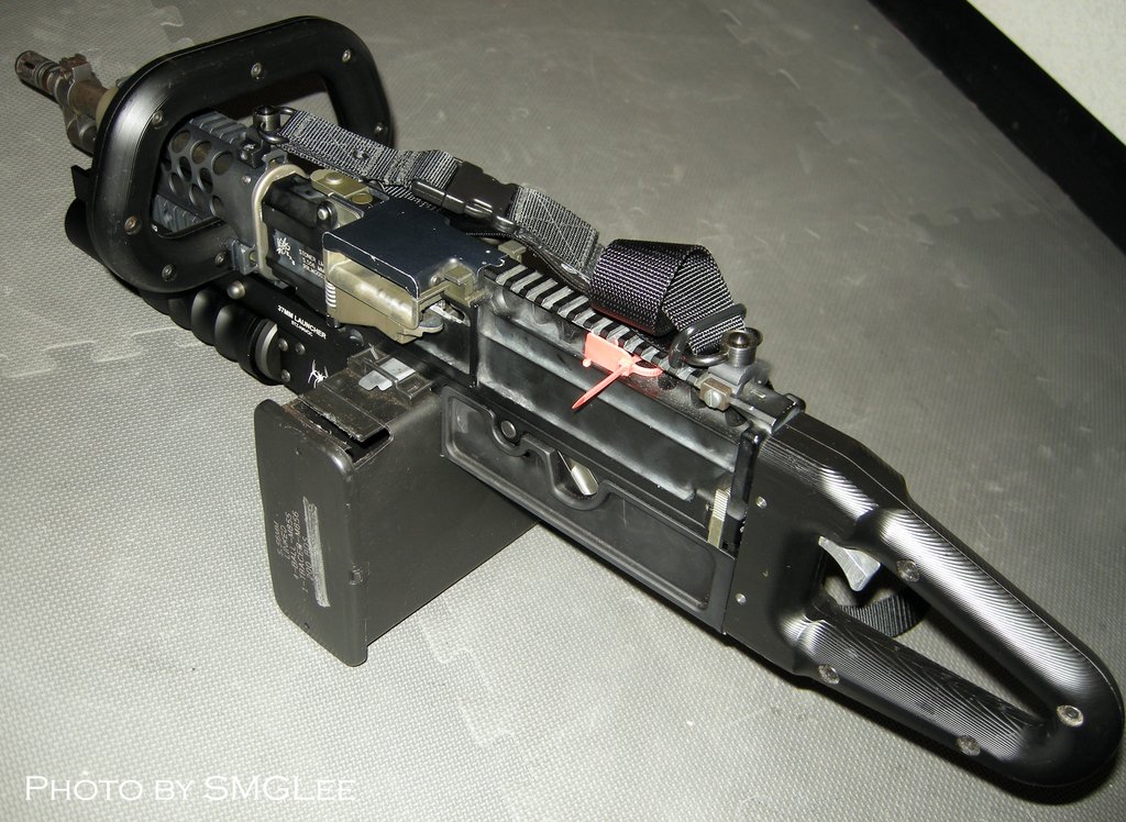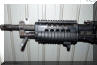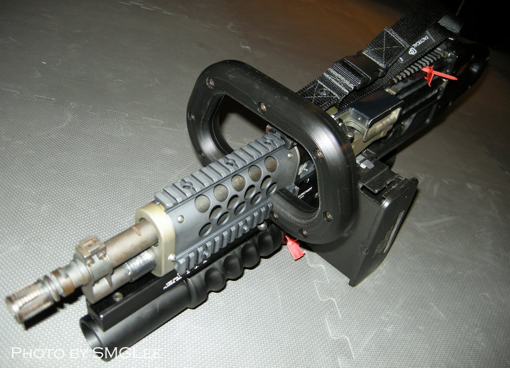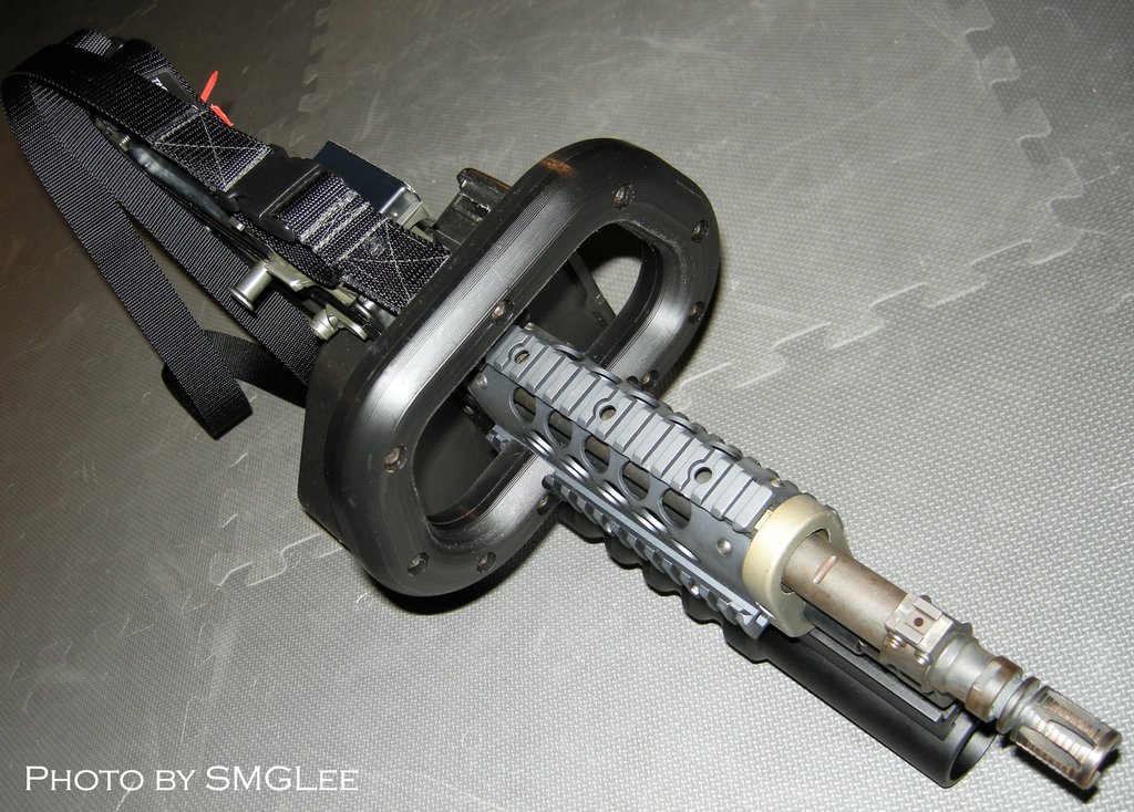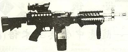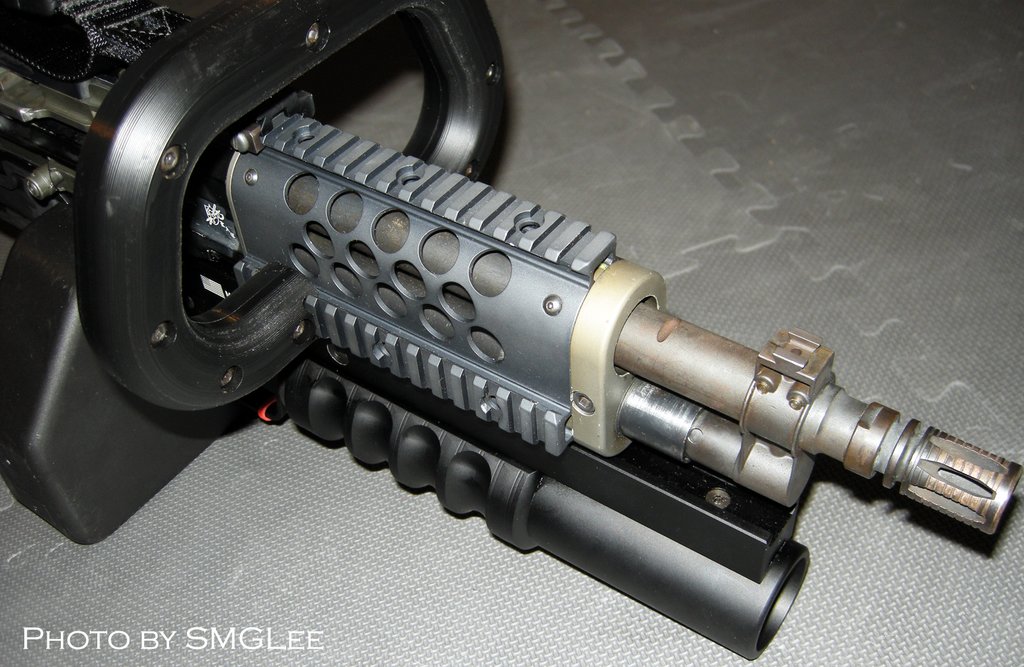 这是被称为KAC Chain SAW的改型,SAW一方面是班用自动武器的缩写,而Chain SAW又是链锯的意思。这枪看起来的确很像一把链锯。原本我还以为这是一些恶搞的产品,但KAC在SHOT SHOW 2009的摊位上就摆上了这把“链锯”。不过这种只能腰际射击的改型除了好玩和看起来帅之外,我看不出还有其他的优点。