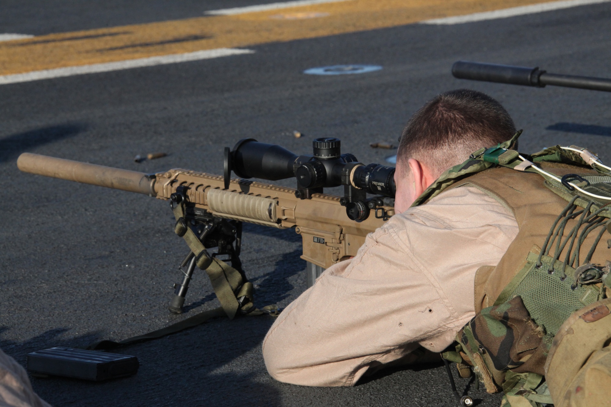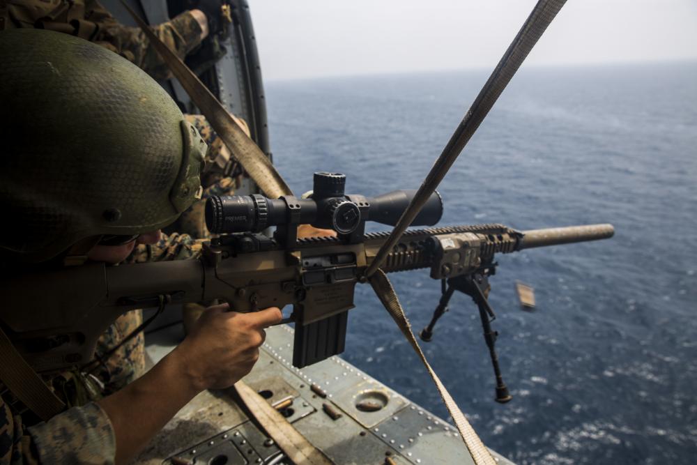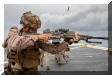 正在使用M110A1上安装的侧面红点镜进行近距离应急射击练习的海军陆战队员