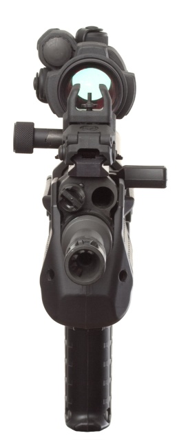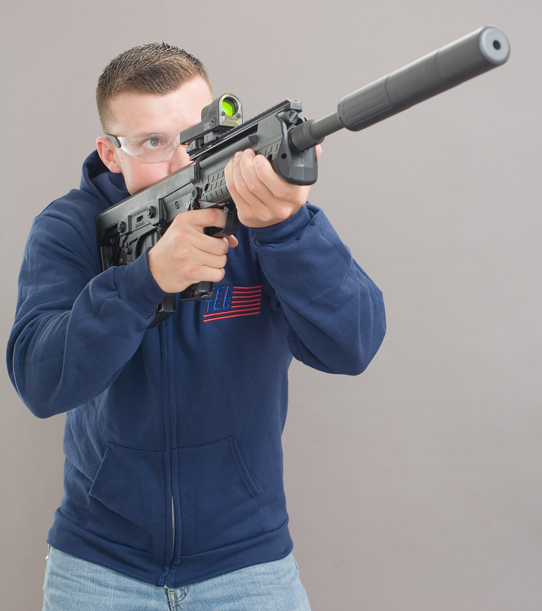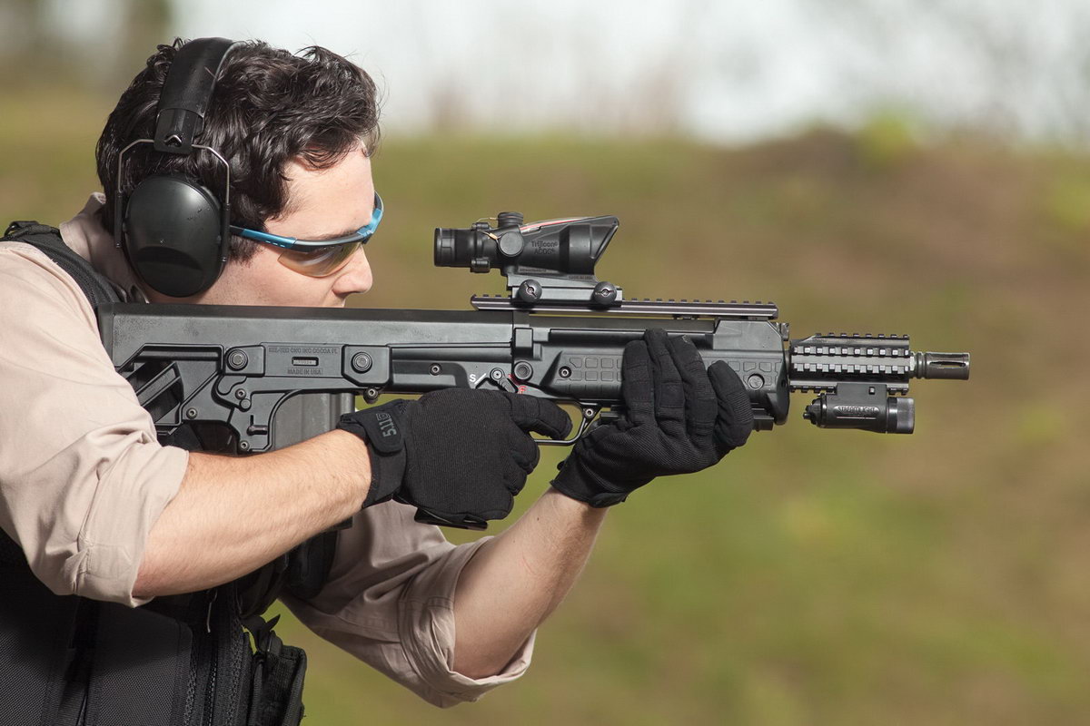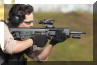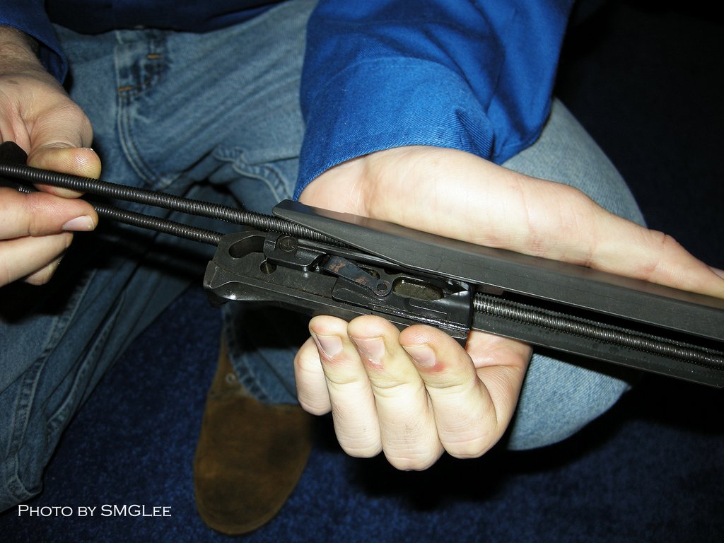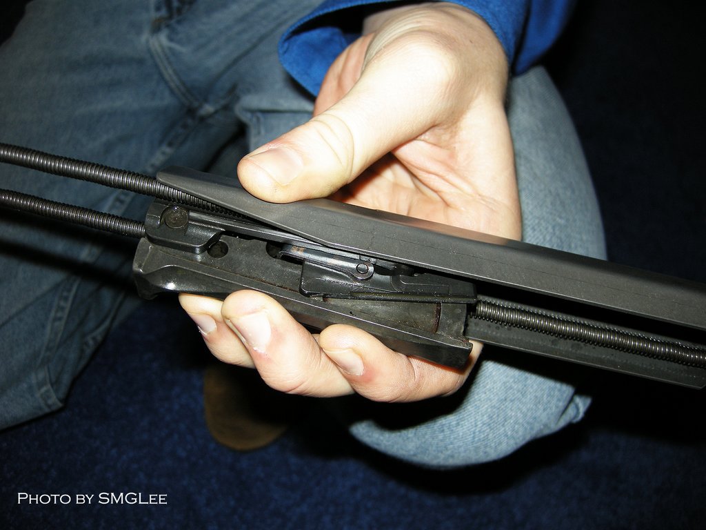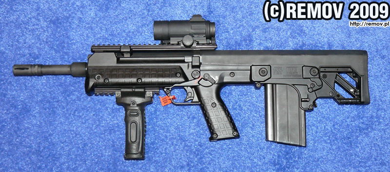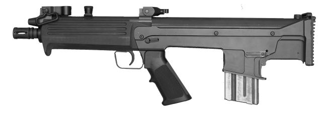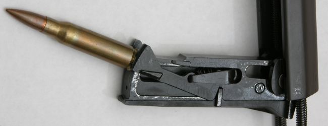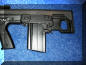另外,RFB的击发机构也是一个创新之处,这种击发机构不像以往的无托枪那样,只是用一根长长的联杆把传统击发机构与前置的扳机联结在一起,而是用一个带助力弹簧的肘节式联杆联结,这样的结构虽然使零件增多,结构复杂,但却使RFB的扳机扣力不像传统击发机构的无托枪那样扳机力过大,因此RFB的扳机感比传统无托步枪要好,而且扳机力可调。手动保险柄位于握把上方,可以用拇指操作,但RFB目前只有半自动型(主要针对民用市场),所以没有快慢机。而RFB的这种击发机构如果要增加快慢机,要么只能让快慢机柄位于枪托上,要么就得另外设计一套快慢机的联杆,让快慢机柄可以合并到手动保险旋柄上。