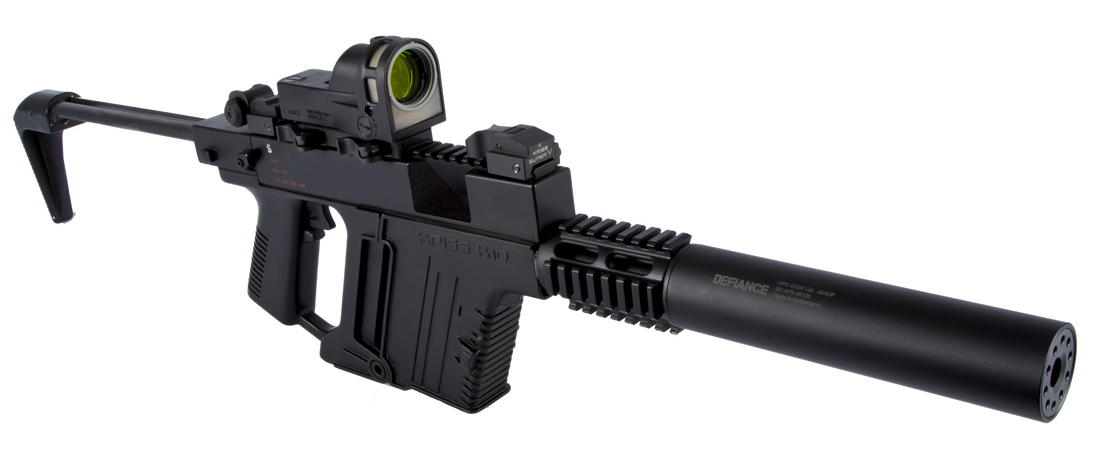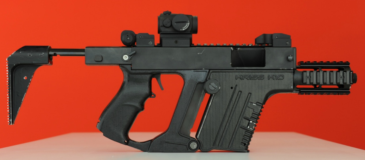 安装消声器的KRISS K10冲锋枪,这不是像Vector CRB那样的假消声器民用型,仍然保留有快慢机