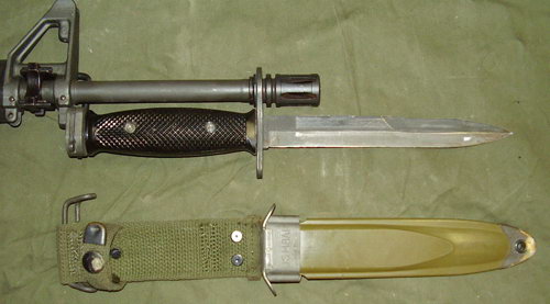 M16系列最早配套的刺刀是M7式,在1961年开始装备,该刺刀为匕首型,既可作枪刺,又可单独使用。但没有血槽和劈砍功能,功能比较单一。而前苏联在1959年就已经为AK步枪配备了多功能刺刀,其后英国等其他国家也纷纷效仿。