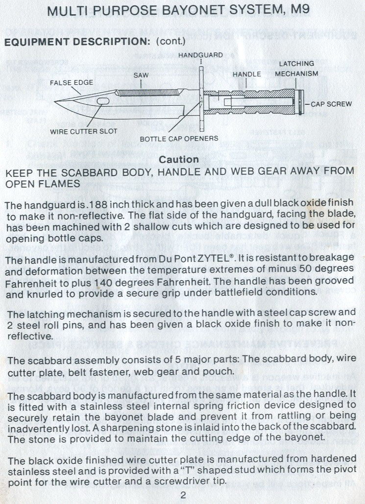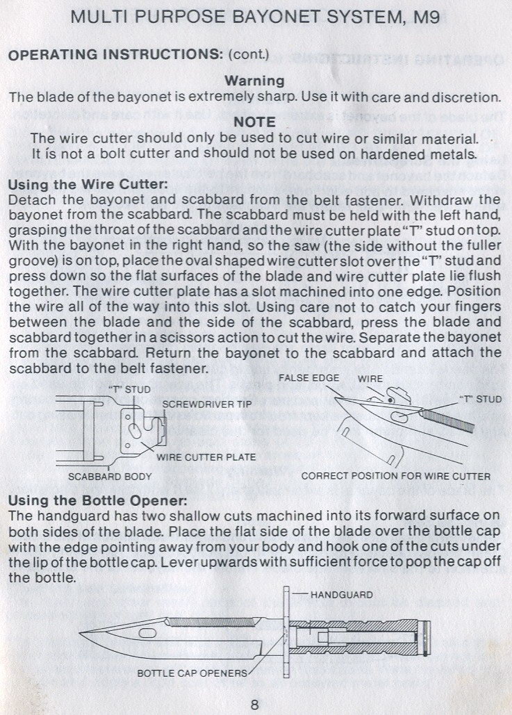 虽然外形有着明显的不同,但M9刺刀在结构和功能上与AK刺刀有很多相似之处,例如M9刺刀也是单刃匕首型,刀背有锯齿,刀身上的长孔套到刀鞘头的驻笋上,可充当铁丝剪。不过M9刺刀还有其他扩展的功能,比如刀鞘背面有一块磨刀石,刀鞘头还有一字螺丝刀的功能。由于是用于M16的刺刀,因此M9刺刀与枪的结合定位方法与M7刺刀相同。