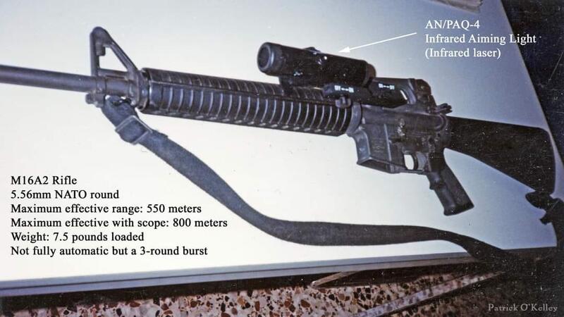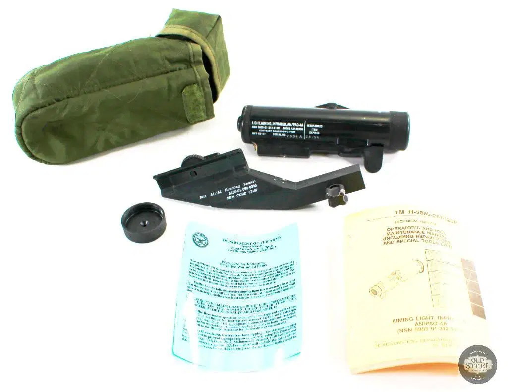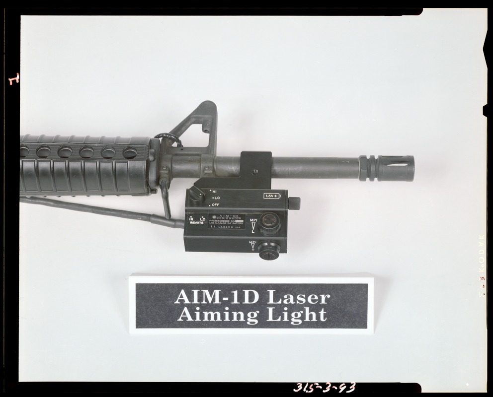 AN/PAQ-4是在1980年左右开始服役的激光指示器,它的外形看起来好像一个战术手电,但实际上发射的是肉眼不可见的红外激光,主要是在夜战中配合头戴式夜视装置使用,比如在1972年左右开始正式采用的AN/PVS-5。当时还没有发明皮卡汀尼导轨,AN/PAQ-4是先安装在一个专门的固定底座上,而这个底座则通过M16提把上的瞄准镜安装孔来固定。安装后这个红外激光指示器是位于护木的左上方。下图可以清楚展示它的安装方式。