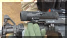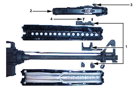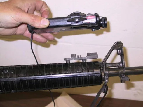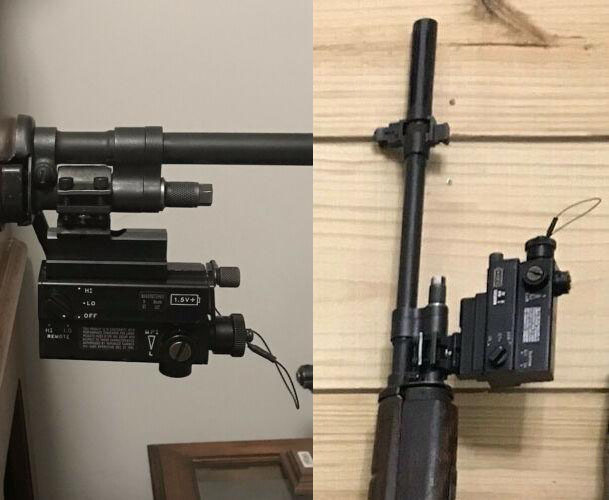 ![]() 早期的AN/PAQ-4C安装方式看起来好像是直接装在护木上方,实际上是安装在枪管上方 |