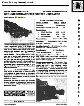 GCP是Ground Commander's Pointer的缩写,根据美军在1996年发布的一份面向三角洲突击队和第24特种作战航空团这两大SMU单位的夜战手册中的描述,在当时这些单位就装备了名为GCP-1A和GCP-1B的红外激光指示器。后来还有GCP-2A,据说CCT就有装备。在2000年后的一些其他资料里,也有提到GCP系列的使用,涉及到的单位包含海军陆战队、陆军游骑兵等。GCP其实不同于后来的AN/PEQ2等多种枪械用激光指示器,它本身主要用途是地面目标指示和引导空中支援,但配合夜视镜后,在近距离进行作为枪支的应急瞄准手段也是可以的。事实上,后来那些专用的枪械激光指示器同样可以兼职充当目标指示功能,所以当大量装备枪械激光指示器后,GCP系列就不怎么见着了。(网友Cerakote® Cat提供资料)