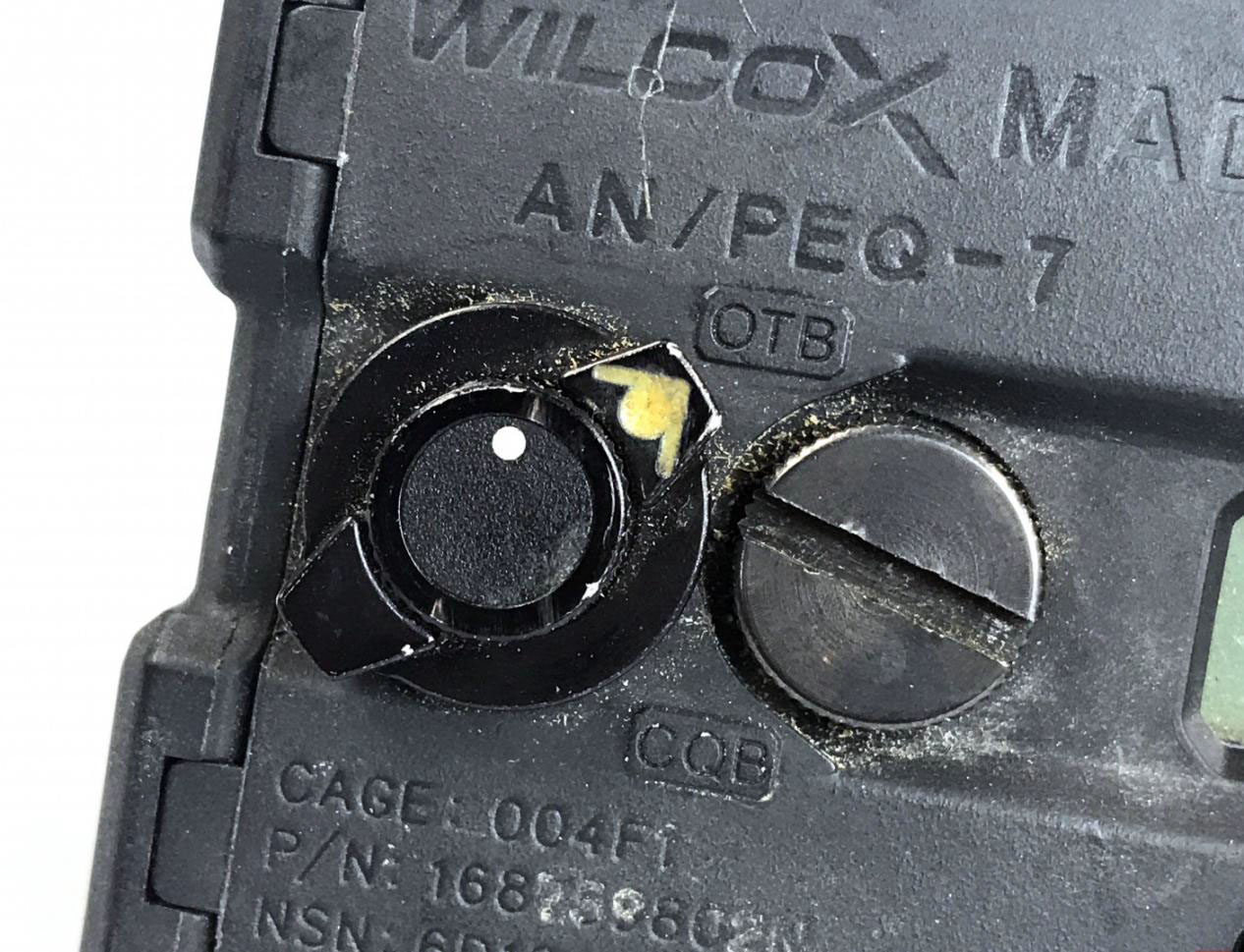 AN/PEQ-7有一个有趣的功能,当射手需要快速切换归零距离时,射手只需要旋转一个带有黄色箭头的大旋钮就可以实现。黄色旋钮周围有两个档位:OTB档和CQB档。OTB代表Over The Beach,该档位的归零距离设置在150米上;而CQB档位的归零距离为7米。旋钮的中心位置是激光瞄准器的风偏调整旋钮。在射手对风偏进行调节时,可以感受到段落感(旋转旋钮有明显咔嗒声)。LCD显示屏的正上方为指示器的总开关。使用者可以在此处为激光器选择低功率输出挡位或高功率输出挡位。AN/PEQ-7由单节CR123 3V一次性电池供电。