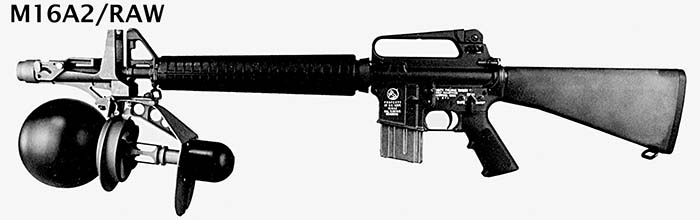 RAW是用一发普通枪弹从M16步枪上发射,采用枪上普通瞄具,通过一个发射支架联接在枪口下方。发射时,枪弹的火药燃气点燃RAW的固体火箭发动机,从而将其发射出去。该系统射击时基本无后坐力,也无可见火光,噪声级别比步枪低,可在封闭空间内发射。
