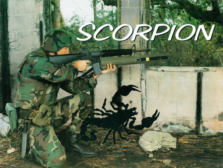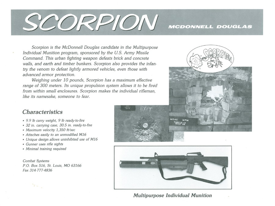 这是美国麦克唐纳·道格拉斯火箭公司参加MPIM(Multi-Purpose Individual Munition,多用途单兵弹药)原理验证试验的竞争产品,名为“蝎子”式下挂发射武器(Scorpion UFW)。采用戴维斯炮原理发射,其外形象M203榴弹发射器,也是安装在M16步枪前端下方,利用步枪上的普通瞄具发射。无后坐力,可在封闭空间内发射,一次性使用。主要诸元:口径66mm,重4.1kg,长79cm,有效射程为50米至300米,300米内可穿透30cm厚砖墙或20cm厚混凝土后再爆炸。弹头为动能/成型装药式,尾翼稳定,对反应装甲有一定效能。不过与HESH-RAW一样,在竞争中失败。