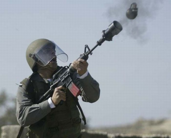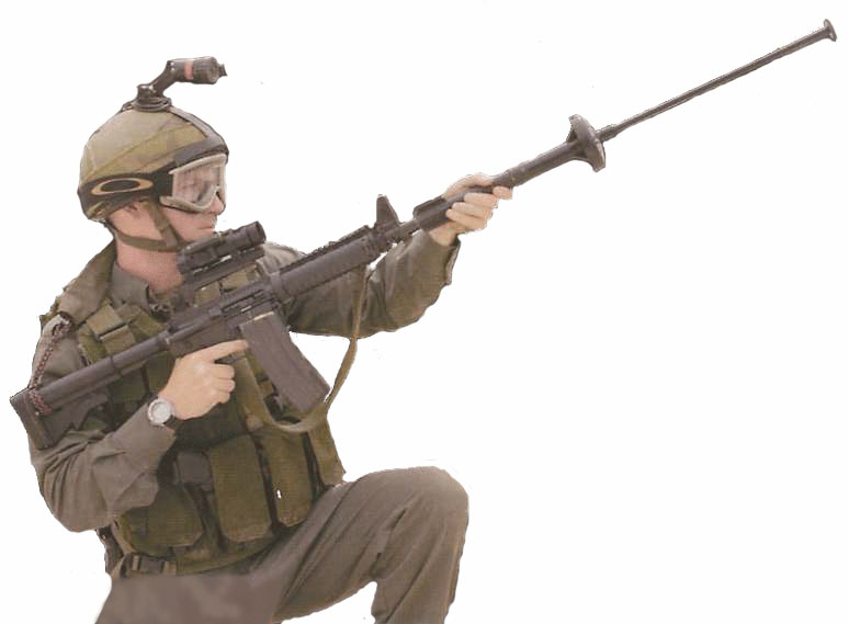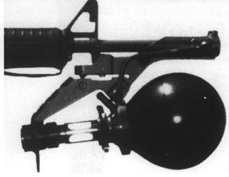M234防暴弹药发射装置(Riot Control Launcher) 是空包弹的火药燃气来推动各类防暴弹的,发射器上有瞄准具,但发射器本身会阻挡步枪的正常瞄准。不过这种 发射器主要用于对付骚乱场面,发射防暴弹药,因此对彷碍步枪的正常使用也没多大关系。