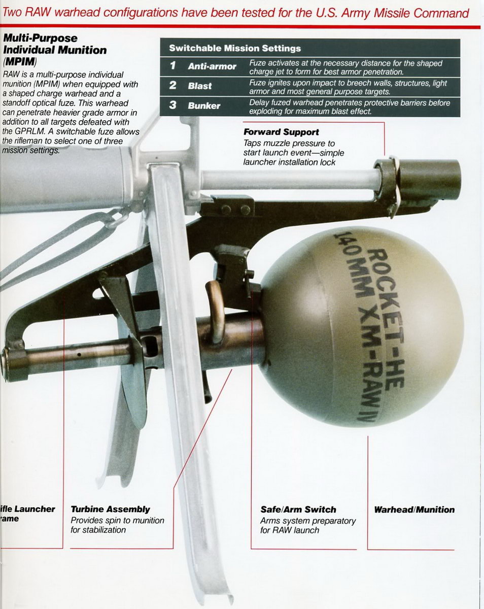 后来RAW改进为新的高爆碎甲-步枪手突击武器(HESH-RAW)参与美国陆军的多用途单兵弹药(Multipurpose Individual Munition——MPIM)计划,与原来的的区别是:采用了一枚由光学传感器引爆的EFP(爆炸成型弹药)战斗,引信具有碰炸/延时功能,可以根据目标性质对引爆方式进行选择。可在200m距离上击穿城市目标、战地工事和轻型装甲车辆。但也竞争失败。RAW系统没有得到美军采用。