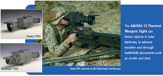 AN/PAS-13 TWS(Thermal Weapon Sight)是热成像的夜视瞄准镜,目前的热成像技术的体积还比较大,因此这种新型的瞄准镜也相当巨大。