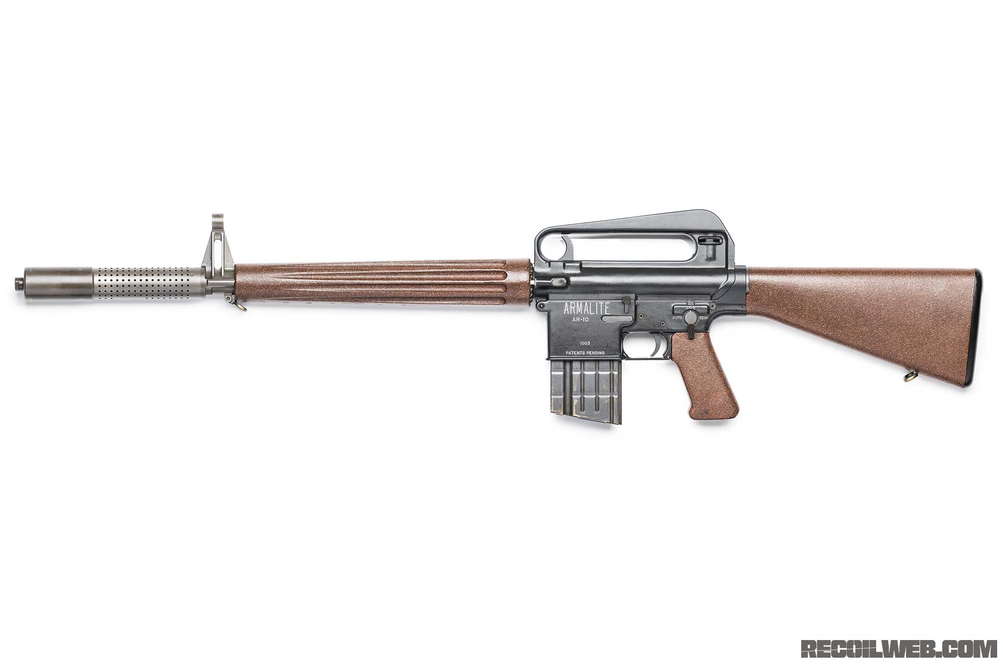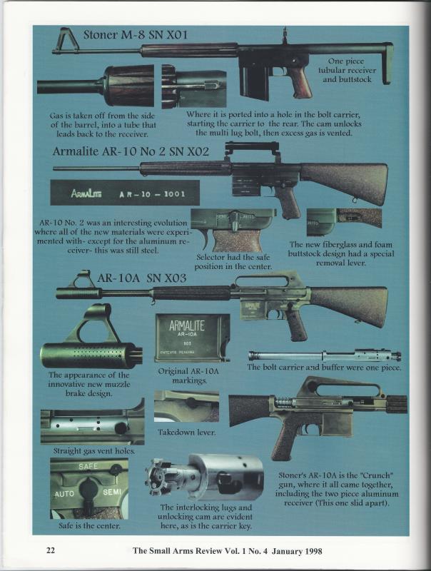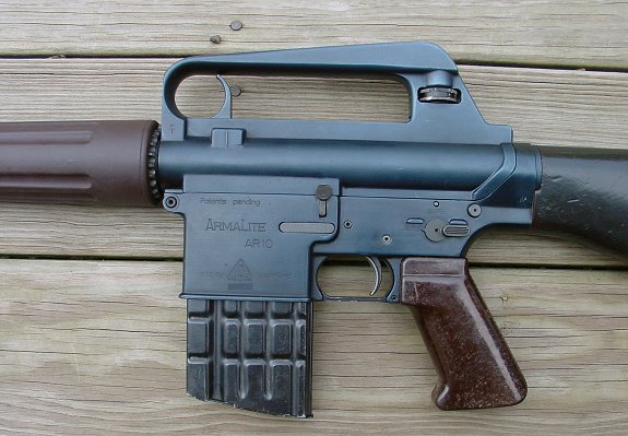 由于AR-10的独特设计,在1955年推出的原型就比当时的两个竞争对手轻了近1公斤,但全自动射击时却比这两个竞争对手都更容易控制,而且握持起来也比同时期的其他武器都要舒服。但美国陆军的严酷试验中发现AR-10的复合枪管不够坚固,为此阿玛莱特改用传统的铬-锄-钒钢合金枪管(chromium-molybdenum-vanadium steel)代替它,但陆军仍然拒绝AR-10。事实上在这次的选型试验中,军队政治一开始就介入得非常严重,AR-10和T48(FN FAL)都遭到潜意识的抵制,虽然这两种设计都很好,但它们都不是春田兵工厂研制的。最后,陆军选择了传统的T44,在1957年开始生产M14步枪。在这次试验过程中,美国陆军对T44的偏坦非常严重,FAL只是个陪太子读书的老外,而陆军一直不给机会阿玛莱特改进AR-10。(说个题外话,我不是说M14就不好,而AR-10确实有较明显的缺点,特别是许多新型材料的应用技术未发展成熟,因此问题很多。M14在性能上的确很优秀,在1980年代我国曾对M14、FAL、G3及多种西方轻武器进行研究性质的对比试验,M14在射击精度、可靠性方面都领先,例如精度上,M14最高、FAL次之、G3最低;射击后坐感方面,也是M14最小,FAL次之,G3最大;但在综合评分上,FAL却高于M14,也许是M14的设计的确太保守了,基本上只是把M1伽兰德改变口径、换成弹匣供弹和增加全自动功能,许多M1伽兰德的缺点都没有改进,例如它只有一个小直径的觇孔,只适合在条件良好的情况下打靶,在琉璜岛战役期间,美军步枪手对抗日军的夜间自杀式冲锋时不得不拼刺刀,不是因为日军冲得太快,而是M1伽兰德在晚上根本无法瞄准。)