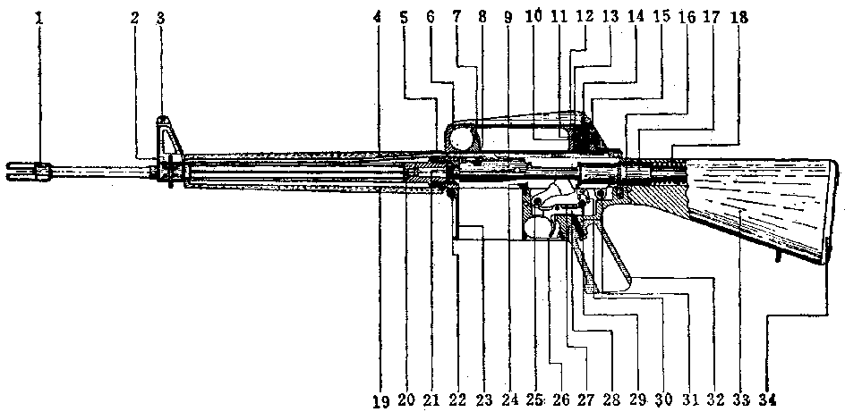 AR-10的剖视固:1-消焰制退器(兼枪榴弹发射插座);2-气体调整螺;3-准星;4-导气管;5-枪管节套;6-提把;7-机柄;8-导柱;9-机框;10-滚花圆环;11-高低调整螺;12-高低调整螺杆;13-高低调整螺孔;14-觇孔表尺;15-风偏修正螺孔;16-复进簧导管阻销;17-缓冲器筒和复进簧导管;18-复进簧;19-护木;20-枪管;21-枪机;22-连接销;23-发射机座;24-空仓挂机;25-击锤;26-扳机护圈;27-阻铁;28-扳机;29-快慢机柄;30-连发阻铁;31-连接销;32-握把;33-枪托;34-托底板。