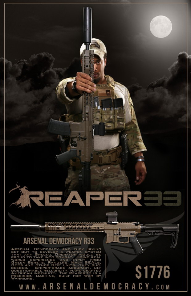 目前AD公司唯一的整枪产品是称之为Reaper 33的AR式步枪。之所以叫这个名称,是他们在设计和推销这件武器时,拉上了一个前75游骑兵团的狙击手Nick Irving一起搞,而Nick Irving的绰号就叫“死神33”,33是此人在一次3个月部署中的射杀数字,所以就用他的绰号来给这件产品命名。