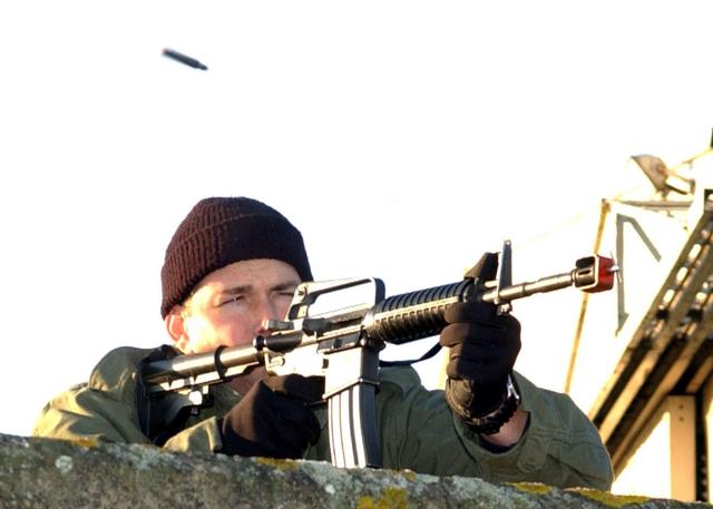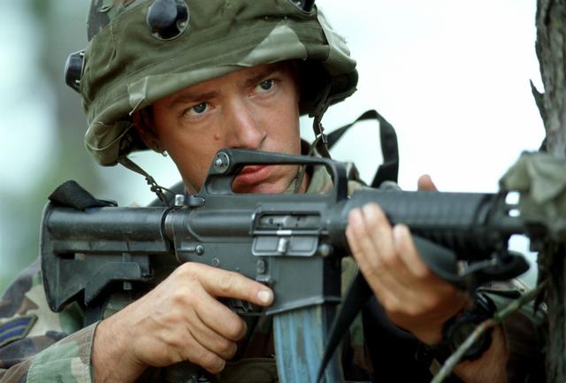 2000年6月,新泽西州迪克斯堡(Fort Dix)的一名空军保安人员使用GUU-5/P在进行激光模拟实战训练训练(DVIC)