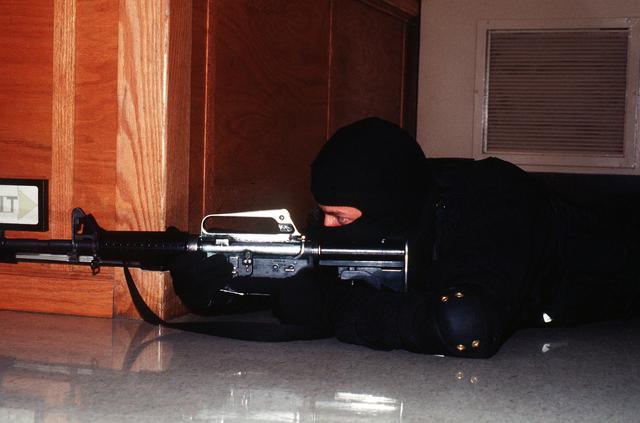 在1996年,一名美国空军的基地保安人员在进行训练,注意看他的GUU-5P是更换了M4枪管的GAU-5/A或GAU-5A/A改装而成的(DVIC)