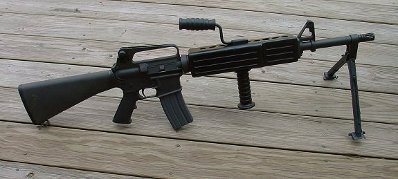 在1980年代期间,柯尔特决定在WAK和BRL的枪的基础上发展出新的同类武器,该武器基本上仍然是改进的M16A1,采用新设计的方形截面护木盖住放大的导气管,在护木顶部有一个提把,在护木下有倾斜角的前握把,枪托内增加了一个液压缓冲器,同样为开膛待击。照门最初仍然是A1式,不久就改为A2式的,该武器只能全自动射击。柯尔特为这种武器配套采用MWG公司的90发“蜗牛”型弹鼓(当时BETA C-Mag未推出)。在枪管上的消焰器后方,还安装了一个M60机枪的两脚架。这个型号被称为柯尔特轻机枪(Colt LMG)。