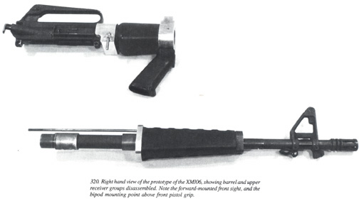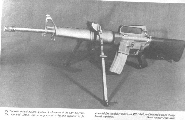 根据美国海军陆战队的需求,WAK公司从1977年开始了“过渡型SAW”(Interim SAW)的研制工作,这是要提供一把更坚固的自动步枪(轻机枪),并参与美国陆军的SAW竞标。WAK的SAW基本上是把M16A1改成开膛待击的枪机,并有一个特别的缓冲器和增加了专门的枪口补偿器。在1978年,美国陆军弹道研究实验室(Ballistic Research Laboratory——BRL)决定在WAK的概念上为SAW竞标提供一个新的竞争者,命名为XM106。BRL的XM106主要是在WAK的SAW上安装了一个固定的护木和一个快速拆卸更换的枪管系统,护木上安装了原先为M14步枪使用的M2两脚架和M16A1握把式样的前握把。早期的XM106还把准星前移以延长瞄准基线,提供远距离上的更精确的火力,但在后期型被放弃。最后,陆军在SAW竞标中选择了XM249——FN Minimi。
