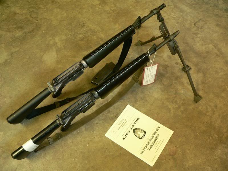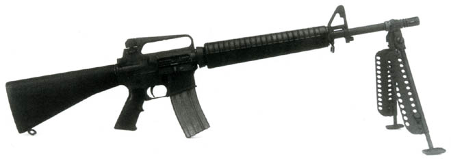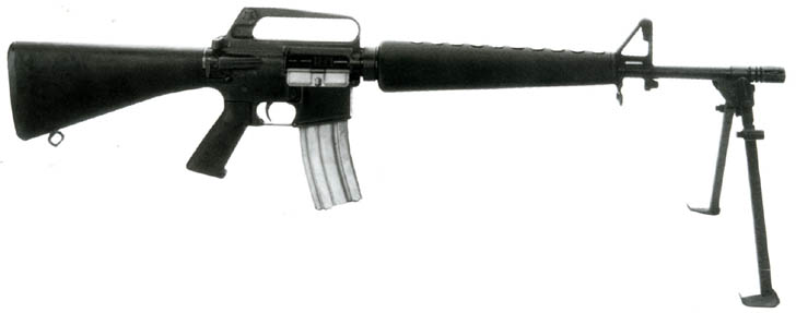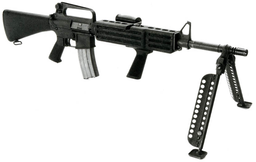 柯尔特公司在1964年推出CAR-15枪族时就已经包括了两种重型枪管突击步枪(HBAR,即轻机枪),这些武器是设计用来代替M1918 BAR的。BAR原本计划被M15——M14的轻机枪型所取代,但由于M15计划被取消,BAR最初被M14A1(仍然是M14的轻机枪型)所代替,当M14从前线撤装时,美军的自动步枪手(美军术语里面的“自动步枪”是指班用轻机枪)只能使用与步枪手相同的M16A1,只是规定步枪手尽量用单发射击,而自动步枪手则尽量用连发射击。柯尔特606型CAR-15重型突击步枪M1和重型突击步枪M2就是采用重型枪管来维持自动射击的M16型号,并采用整体式两脚架,重量比一般的M16大得多。陆军在SAWS(Small Arms Weapons System,枪械武器系统)计划中购买了不足200挺用于试验,不要把这个计划与后来诞生M249的SAW(Squad Automatic Weapon,班组自动武器)计划混淆。