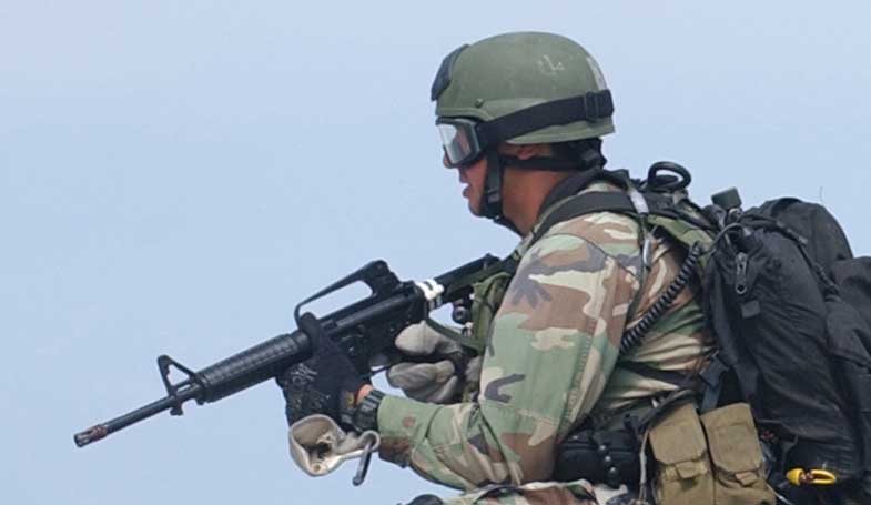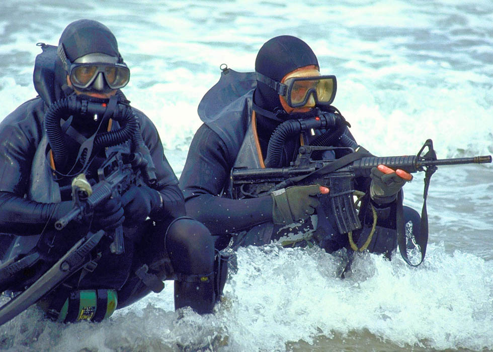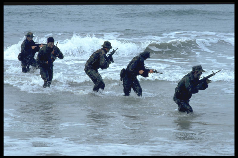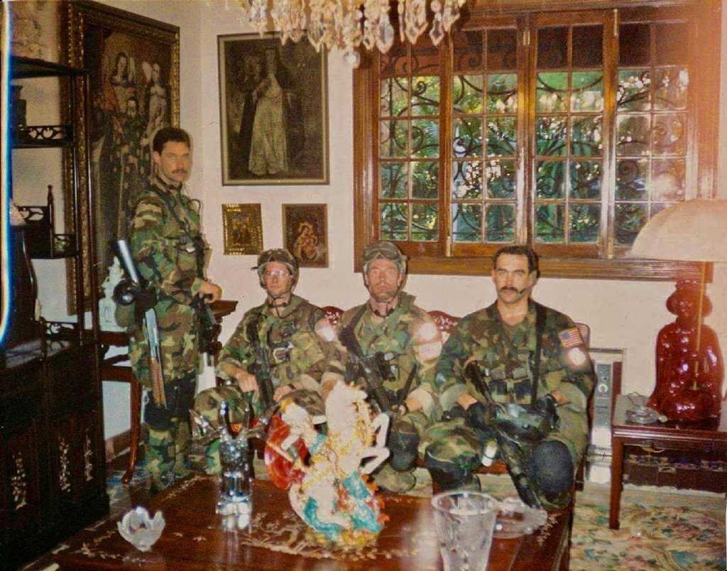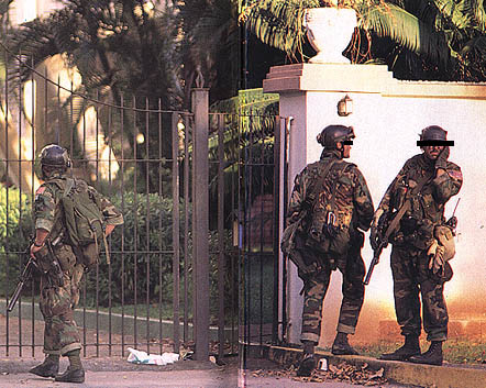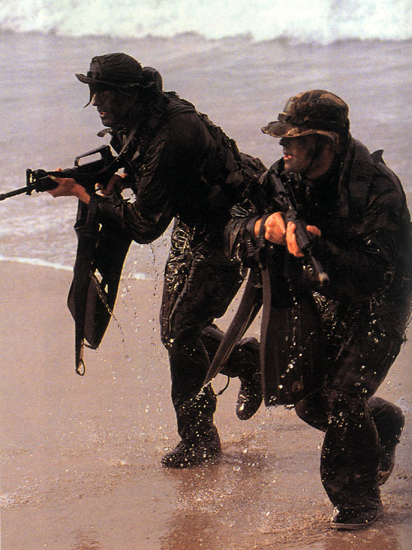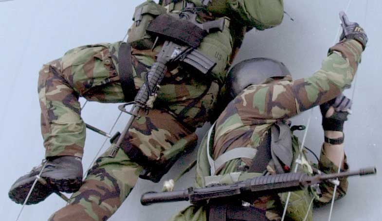 ![]() 1989年入侵巴拿马的“正义事业行动”中的三角洲队员,手上的枪是安装了OPS 3RD消声器的723型 |