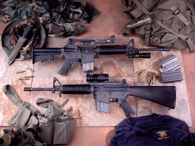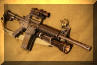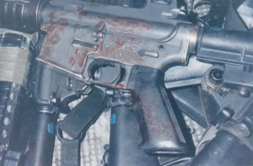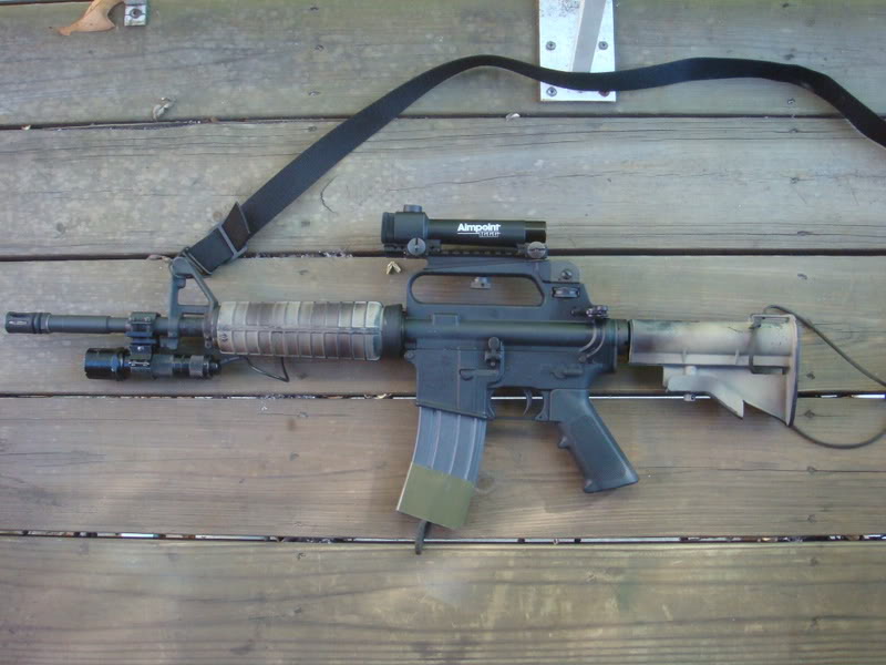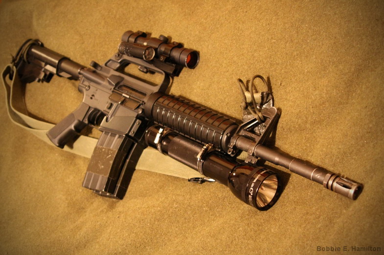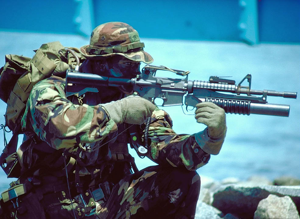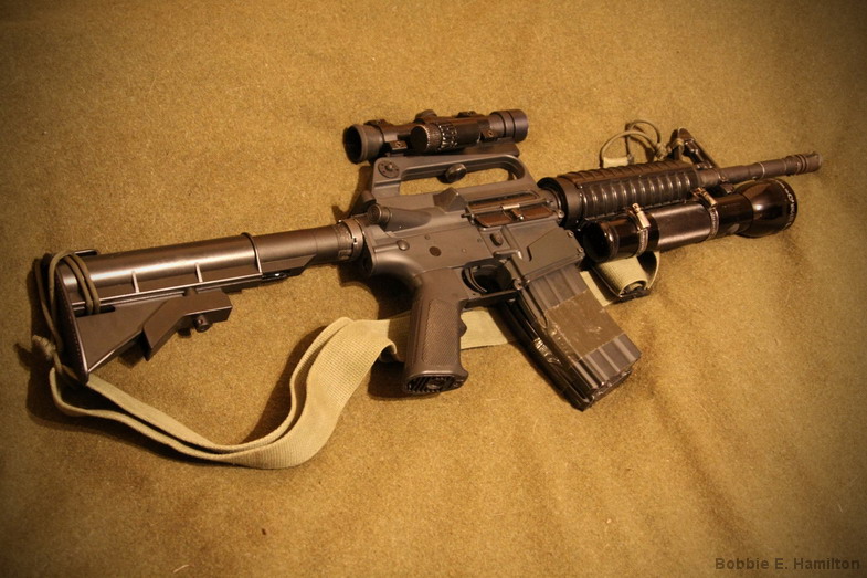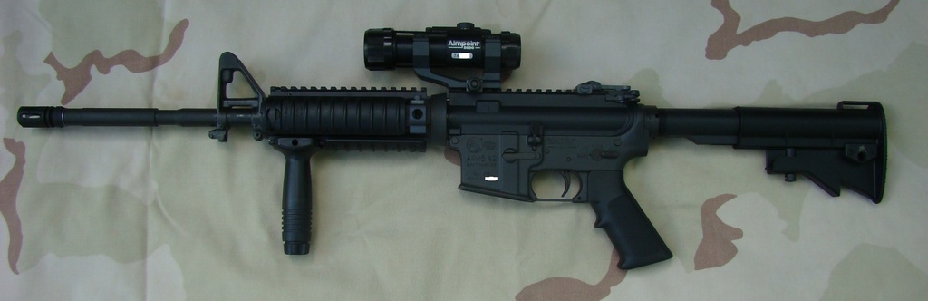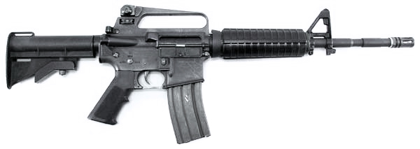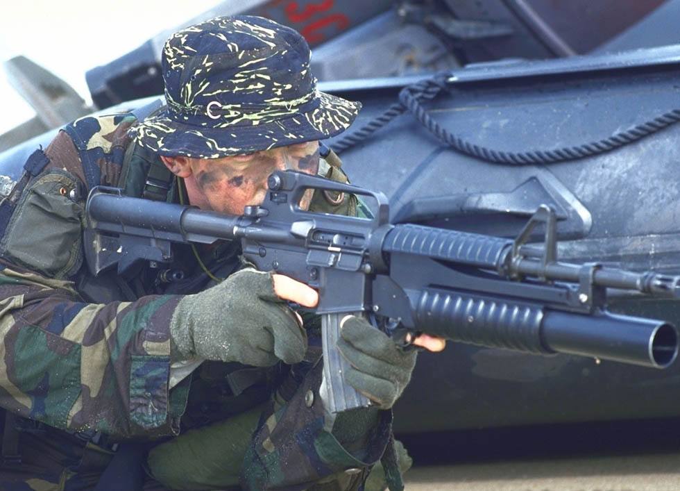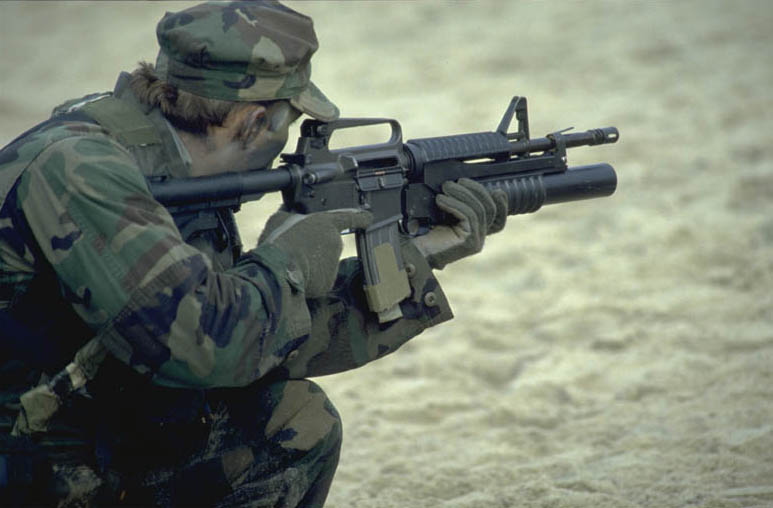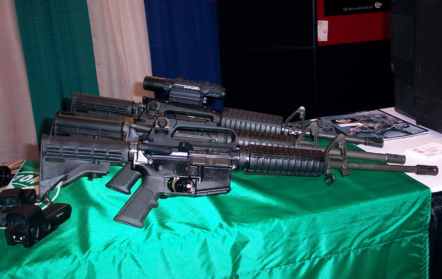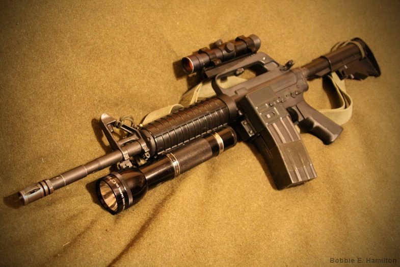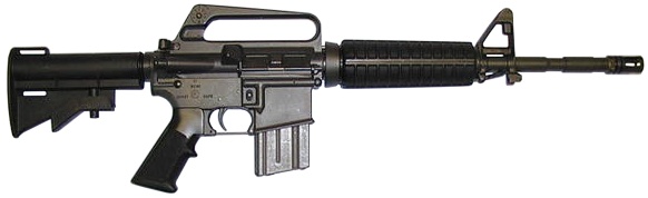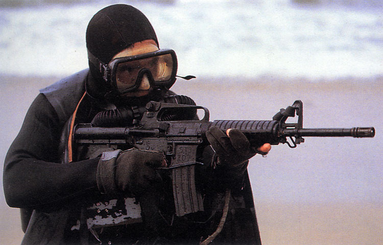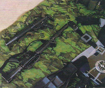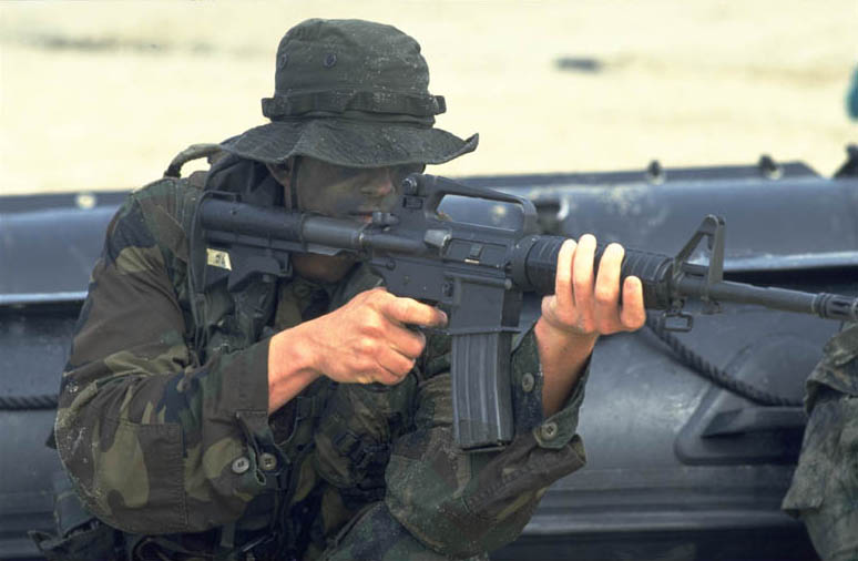 1993年在索马里时的游骑兵特遣队中的三角洲突击队员所使用的CAR-15,通过照门类型判断应该是723型,此外当时美军特种部队开始大量使用Aimpoint 3000或5000型红点镜
