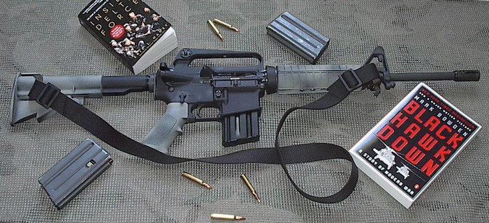 用半自动民用型涂成模仿Model 723的卡宾枪,旁边放着的书是《Black Hawk Down》
