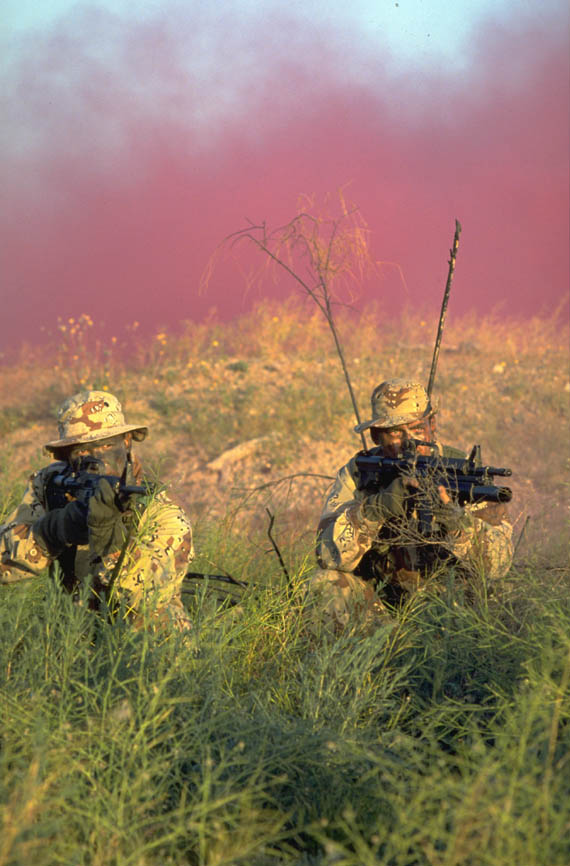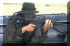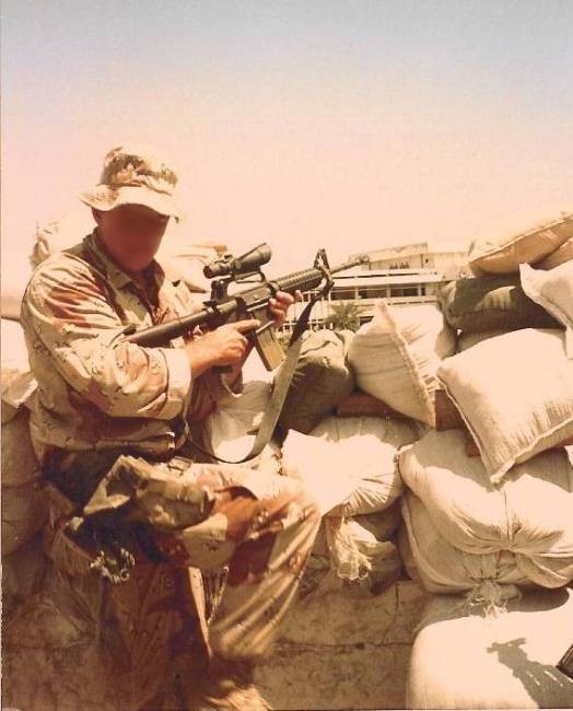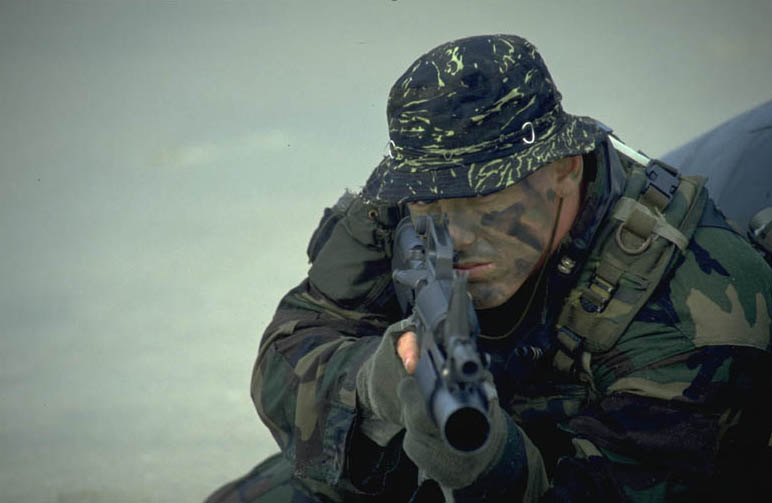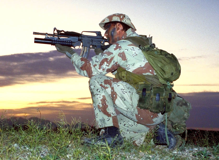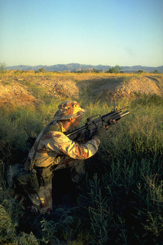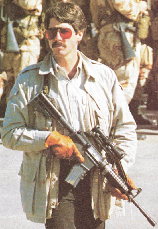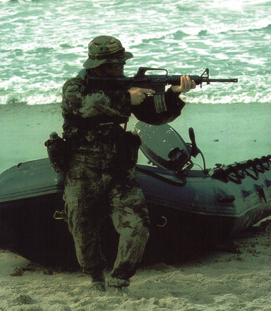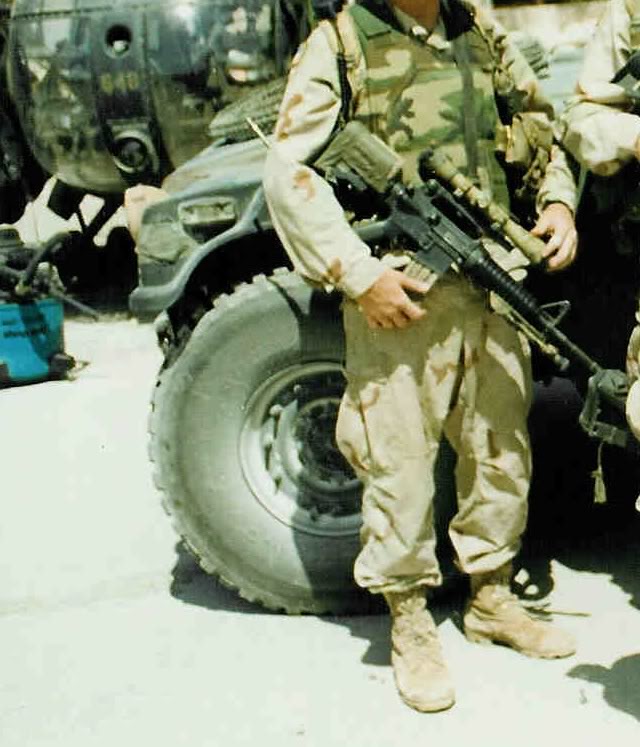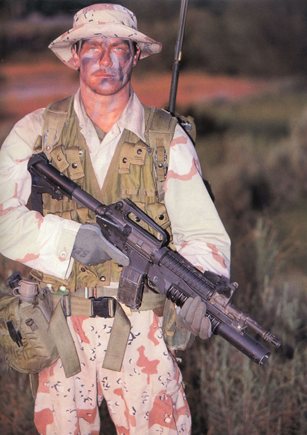 这是扫描自美国MBI出版的《DELTA》一书,图片说明说这是在1991年海湾战争中,在伊拉克南部的一名手持CAR-15卡宾枪的三角洲突击队员,应该是723型