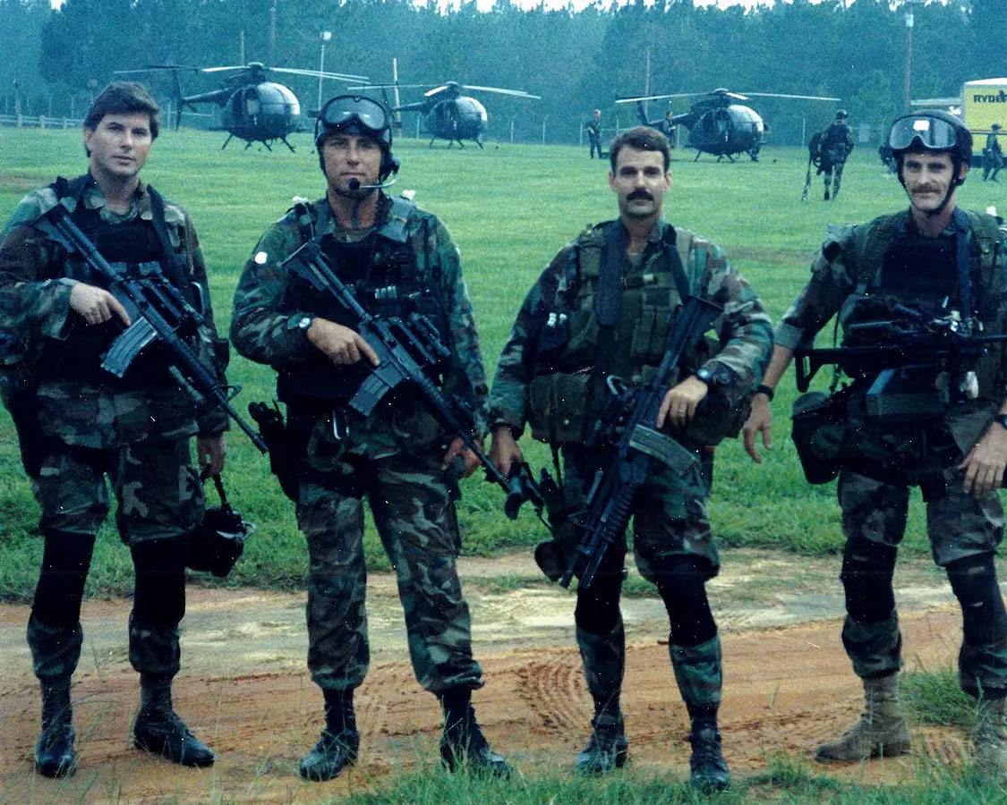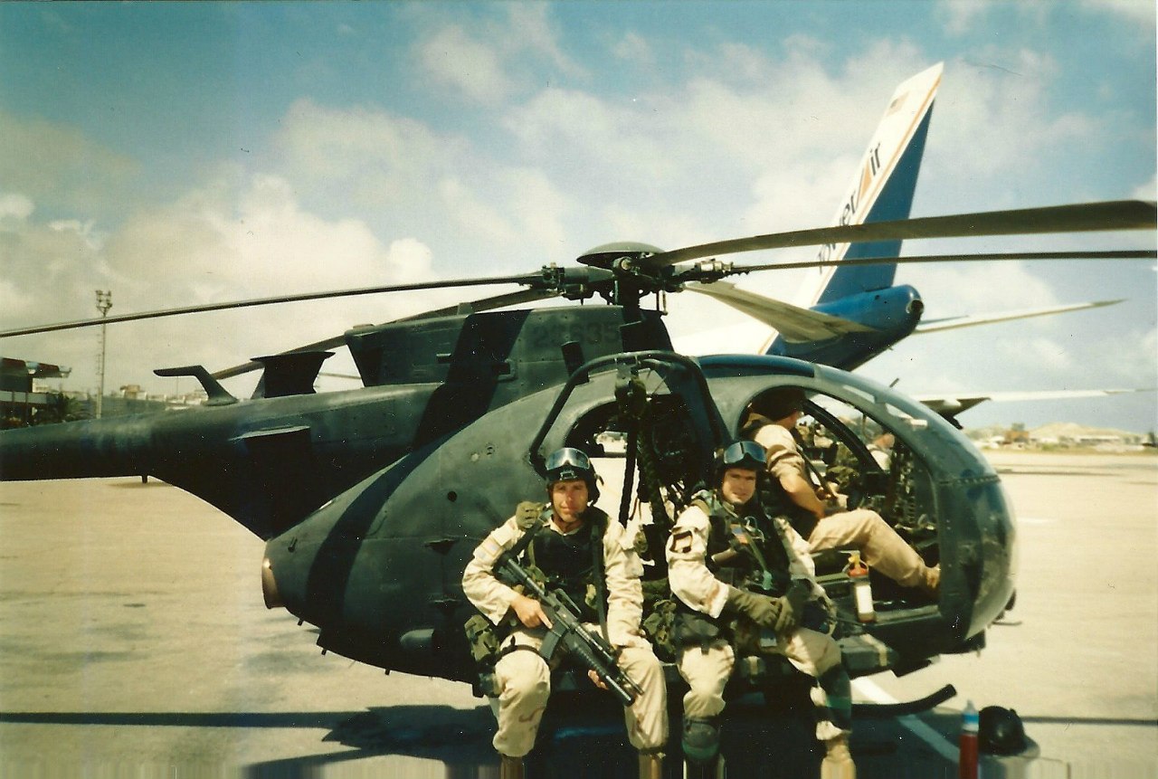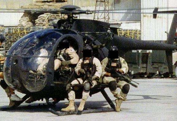 哥特蛇行动中乘坐MH-6的三角洲队员,图中可见挂在CAR-15下面的“万能钥匙”霰弹枪
