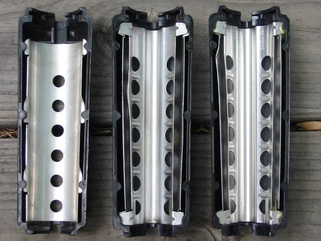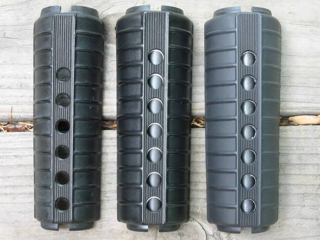要从视角上判断护木的类型,除了比较护木粗细与枪管、机匣的比例外,还可以看看散热孔数量。723或727型均为6孔(左一),而M4系列是7孔(右边两个)