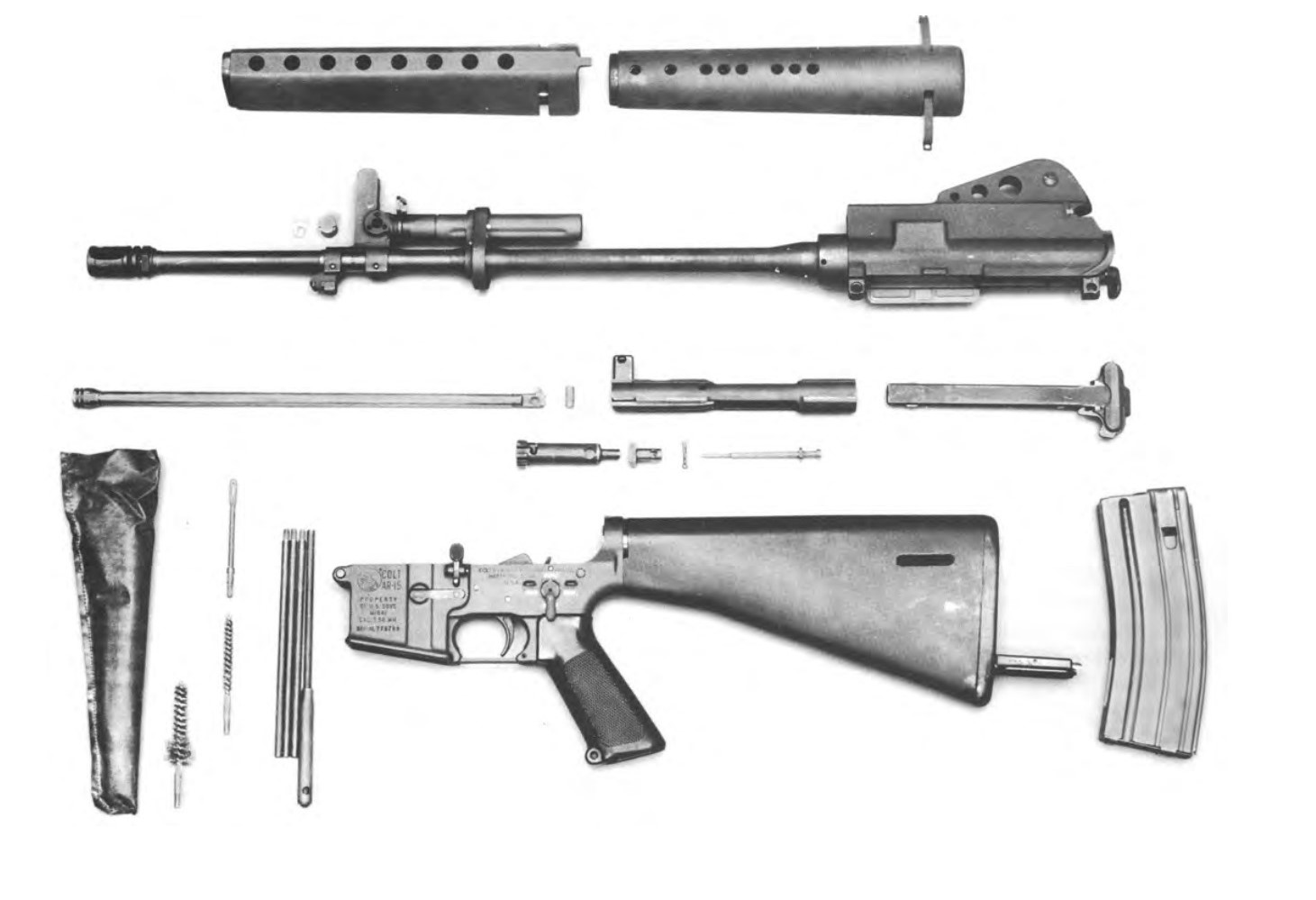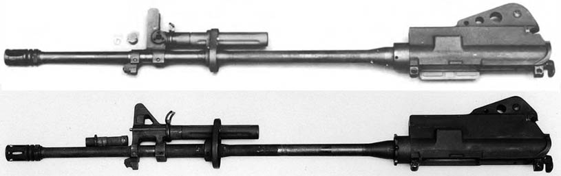 柯尔特703的导气系统类似AK,活塞筒较粗,而活塞和活塞筒内壁缝隙大,能容纳污物,提高活塞动作可靠性。从细处看,活塞筒有纵向的凹下去的棱,活塞在活塞筒内壁几条隆起的棱限制定位之下运动,接触面较小,从而可以减小摩擦力,避免了活塞运动时的过度抖动,减小了活塞、活塞筒间缝隙对精度的影响,同时棱之间有足够的缝隙,保证其可靠性。 另外,两者的导气箍和气体调节器有一些区别:原型枪1使用直准星座,气体调节器则类似rpd。原型枪2使用使用三角准星座,现代常见的气体塞气体调节器。 Colt 703的枪管和m16a1类似,都是20英寸枪管,膛线为6条,缠距为1:12,用于发射m193弹。不过原型枪2的护木前盖到导气座之间的枪管和原型枪1相同位置的枪管相比,有一定加厚。 |