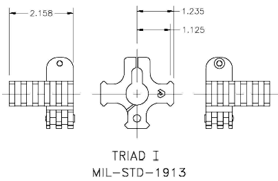 安装在准星座下方的TRIAD I导轨座,在3、6、9点钟方向各有一段导轨