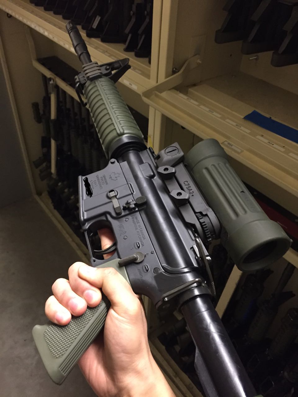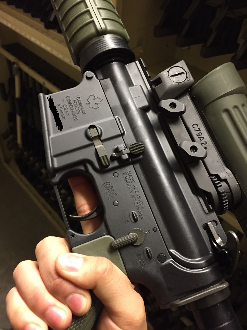 加拿大陆军服役的网友黑水雇佣兵提供的照片,是一把2009年生产的C8A3,是他们单位刚到手的(此前他们单位一直使用C7A2)
