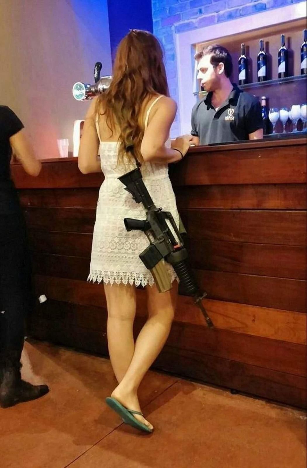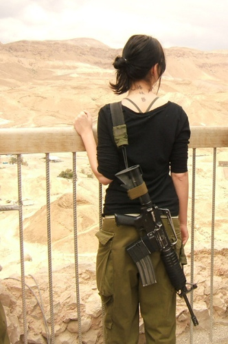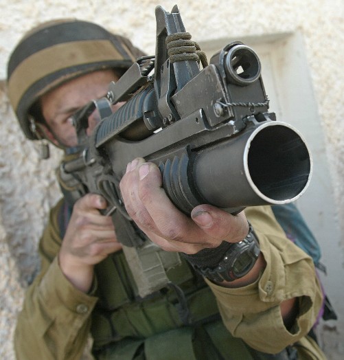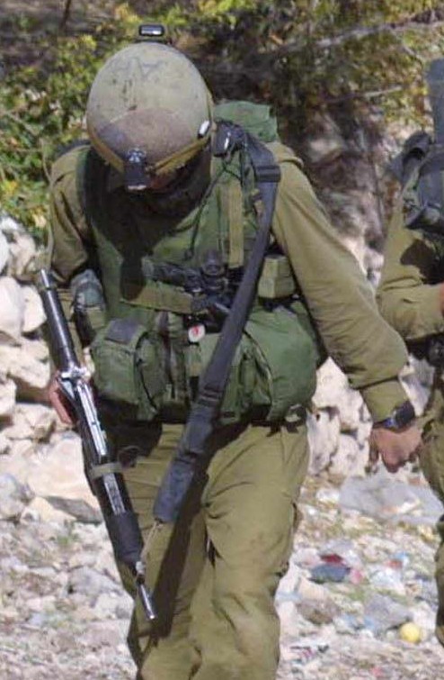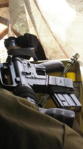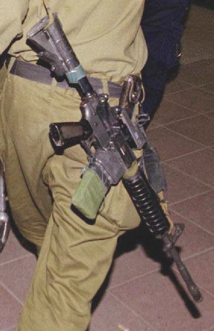 这名以色列国防军的士兵同时携带两支步枪:14.5英寸枪管的标准CAR15和10英寸枪管的截短型CAR15。他同时携带两支步枪,可能是因为截短型CAR15的膛压较低,不适宜发射防暴橡皮子弹,因此专门用一把标准的CAR15装上枪口装置发射橡皮子弹,而那把截短型CAR15估计是他自己增加的,用于发射普通子弹,以备紧急时杀敌自保。