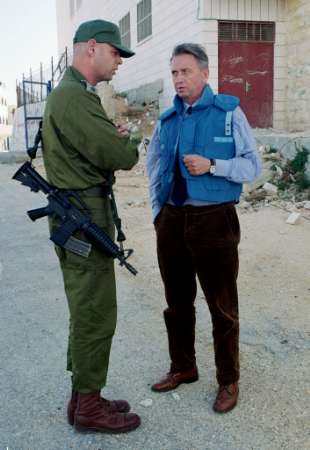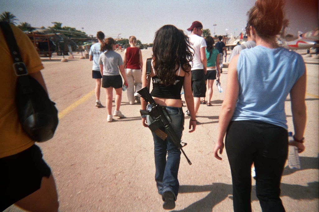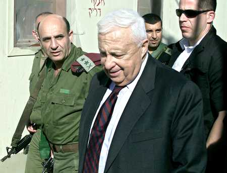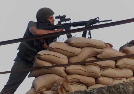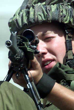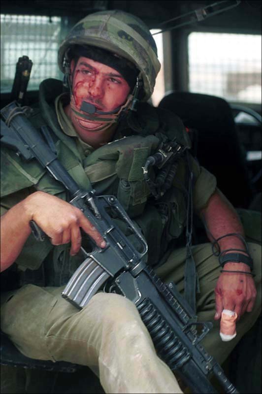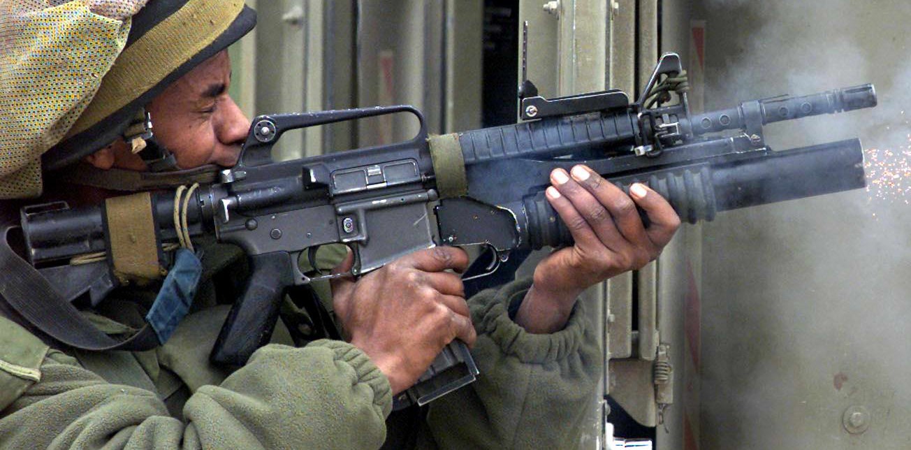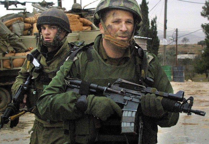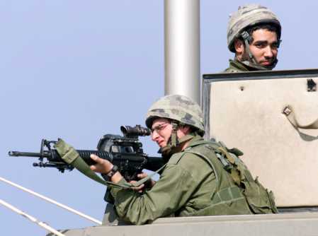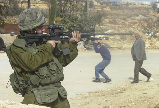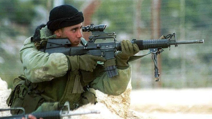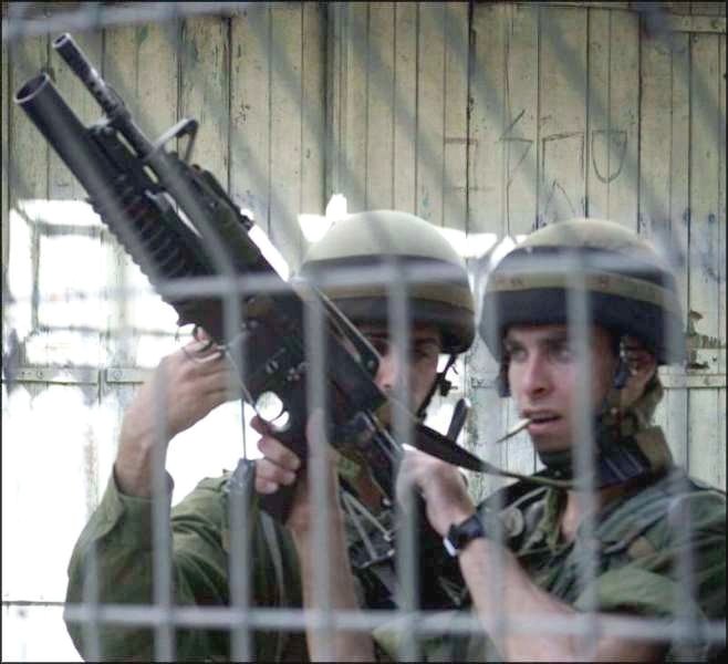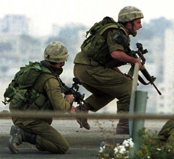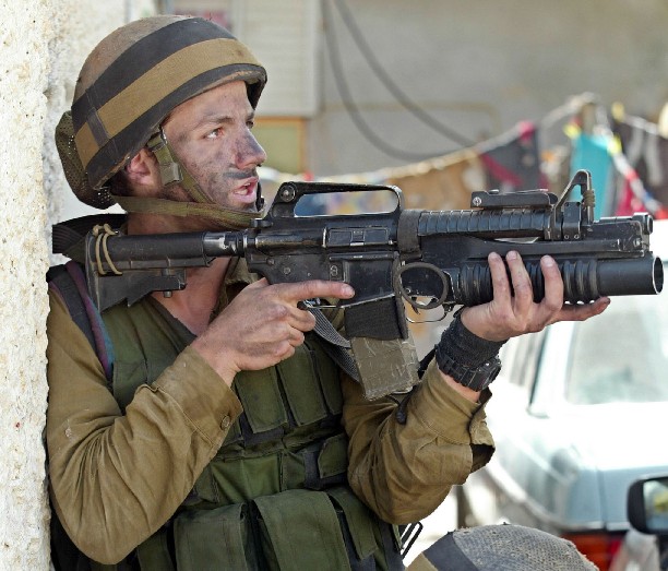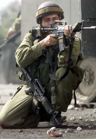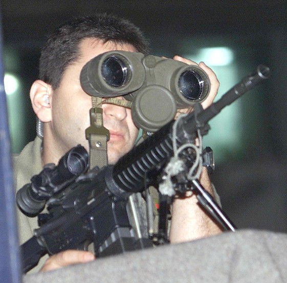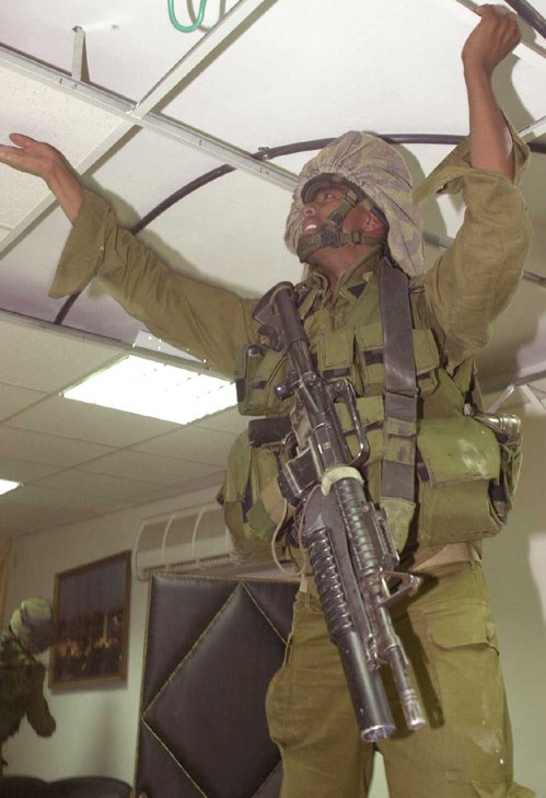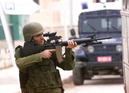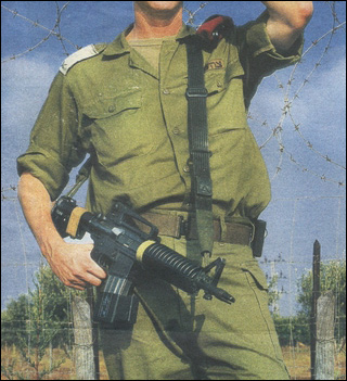 以色列总理阿里尔·沙龙2001年4月到被占巴勒斯坦视察。护卫的士兵是携带截短型CAR15