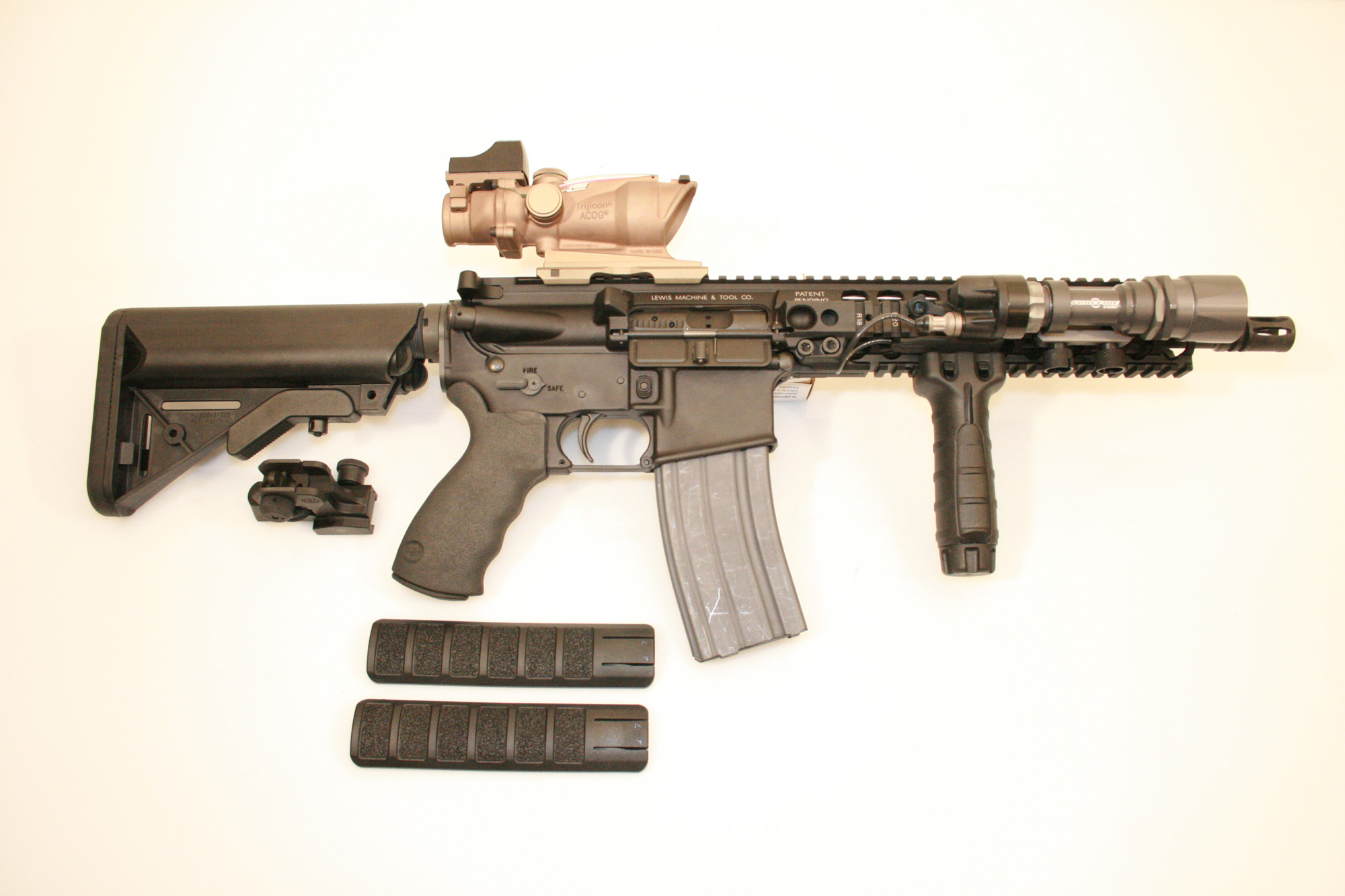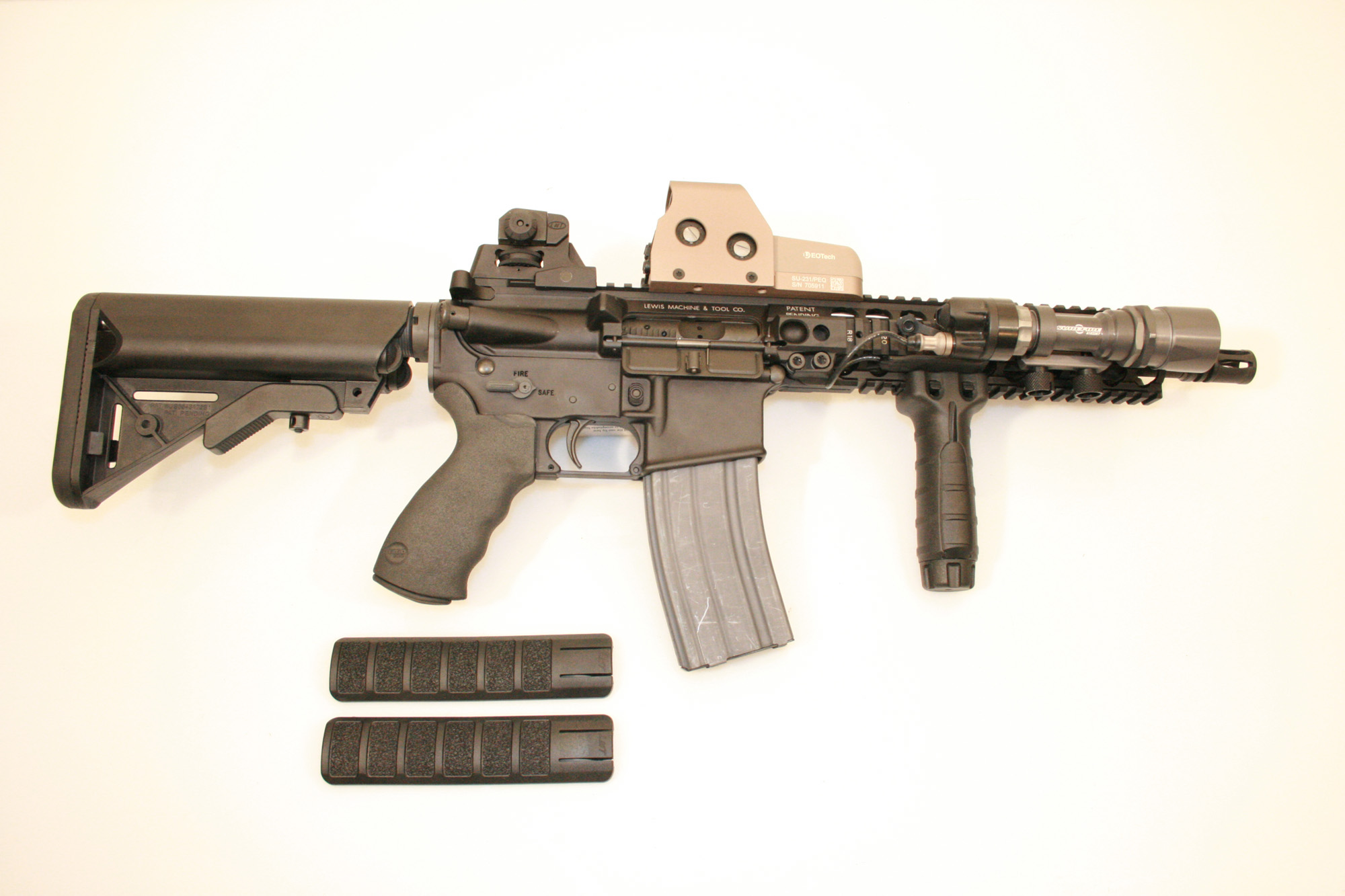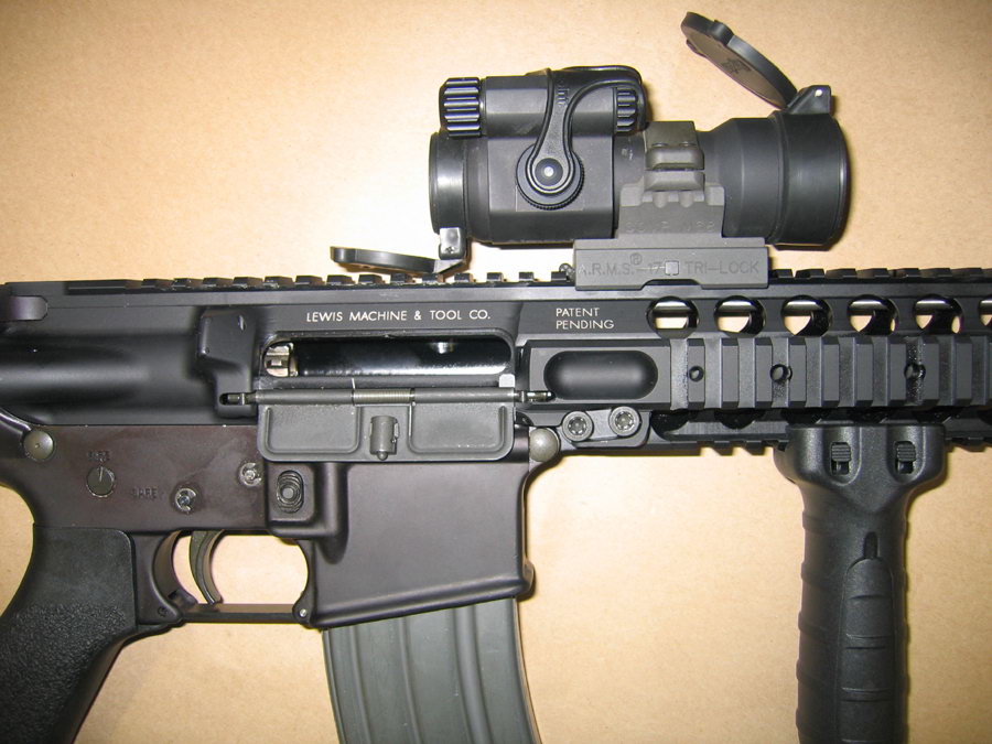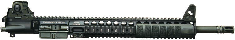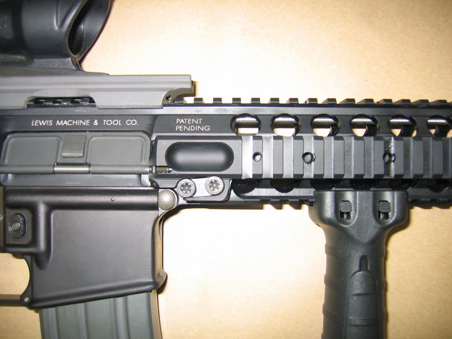 路易斯机械与工具公司(Lewis Machine & Tool,简称LMT)的独立导轨平台(Monolithic Rail Platform——MRP)机匣不同于其他AR式的导轨系统——它的导轨护木和上机匣是由一整块铝材用机加生产出来的,而不是各自独立(机匣和护木)。采用这种结构的目的是让该系统具有快速更换枪管的能力——只用一个螺丝起子就能装拆枪管,而且枪管是自由浮置的。
