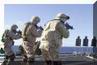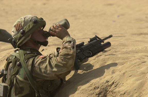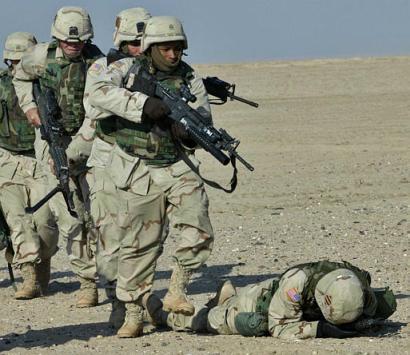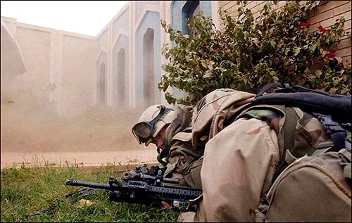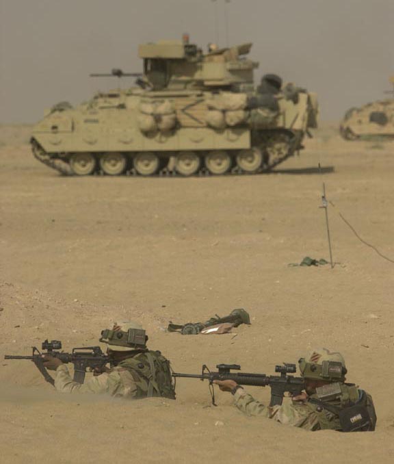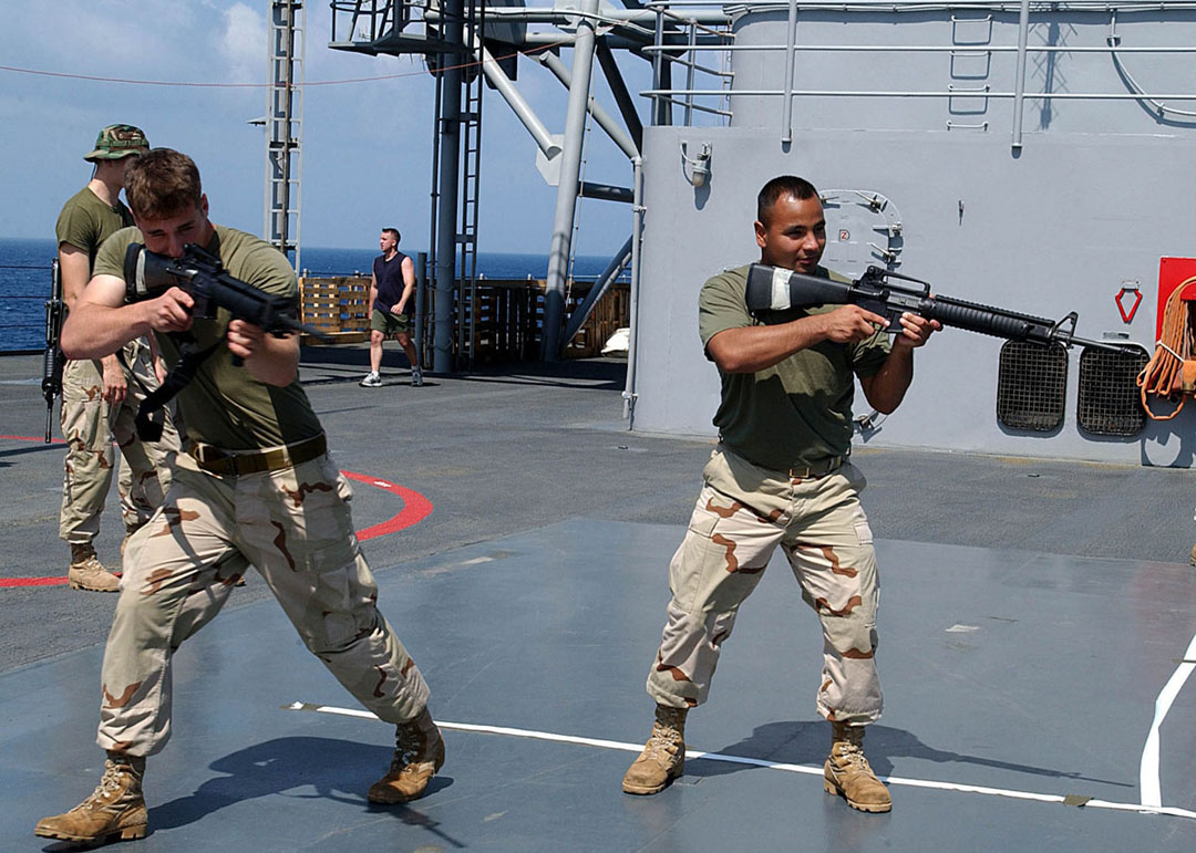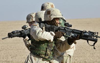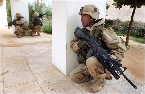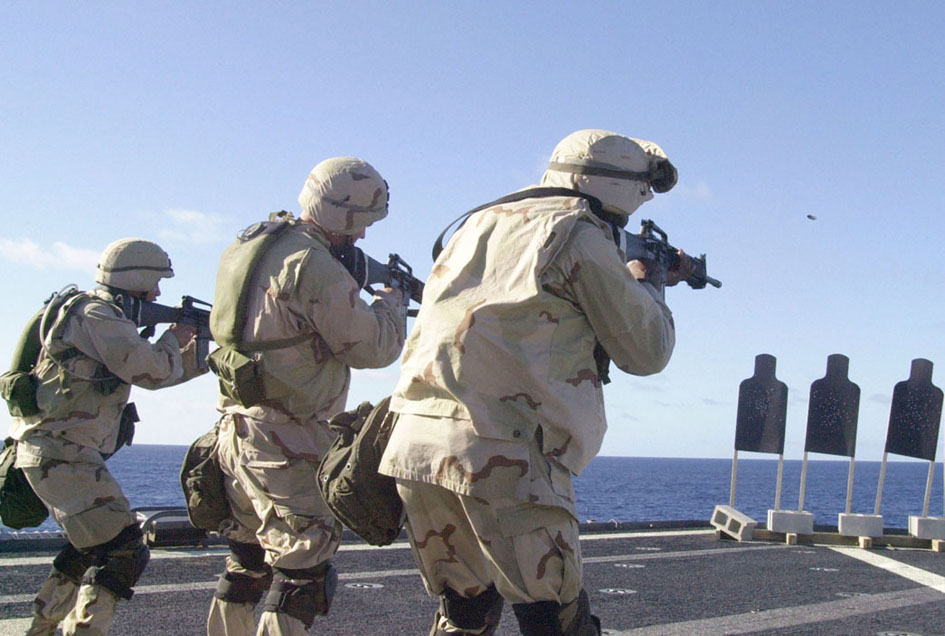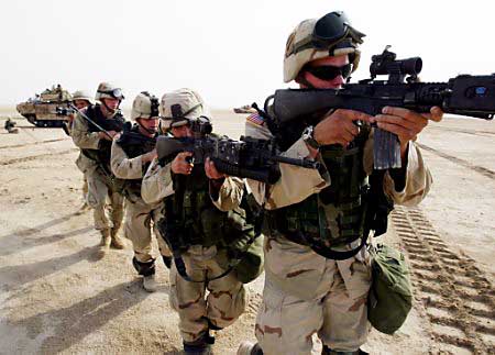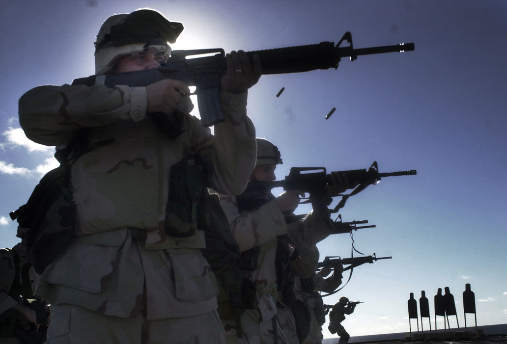美伊高官大打舌战的时候,已经换装了M16A4的海军陆战队员正在航空母舰上加紧练习。但由于FNMI来不及为海军陆战队提供足够数量的M16A4,因此在伊拉克战争中,一个海军陆战队的步兵班只有一枝M16A4,其余士兵仍然是以M16A2为主要武器。(US NAVY图片)