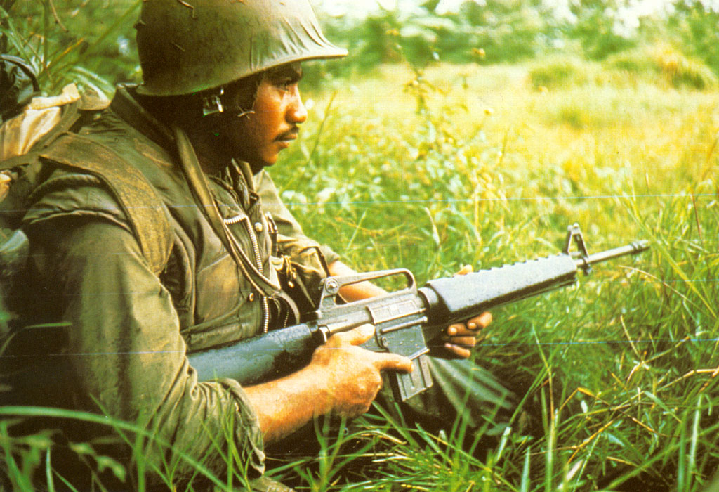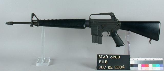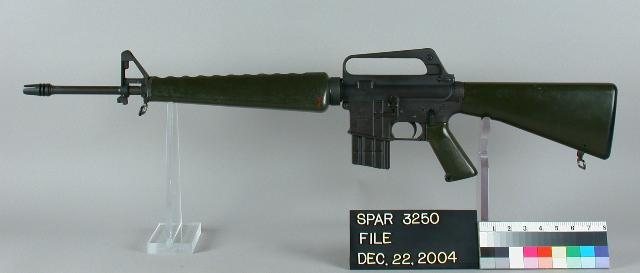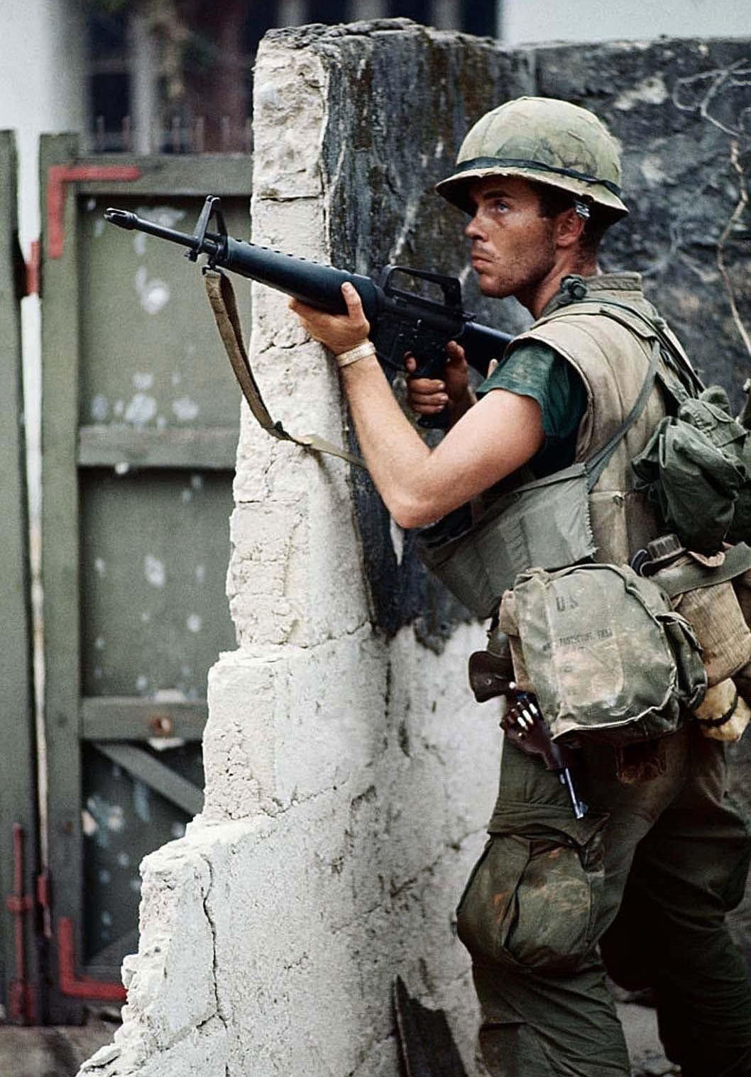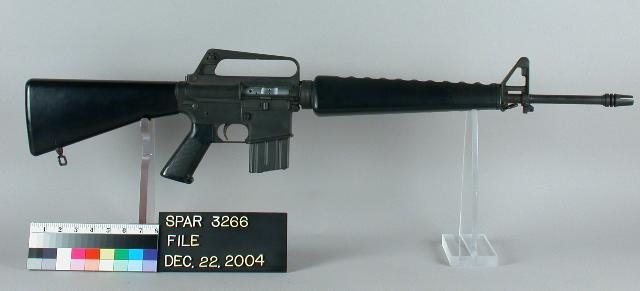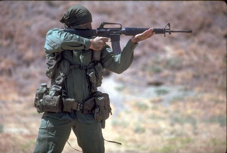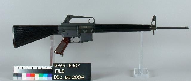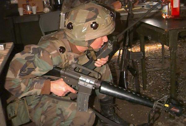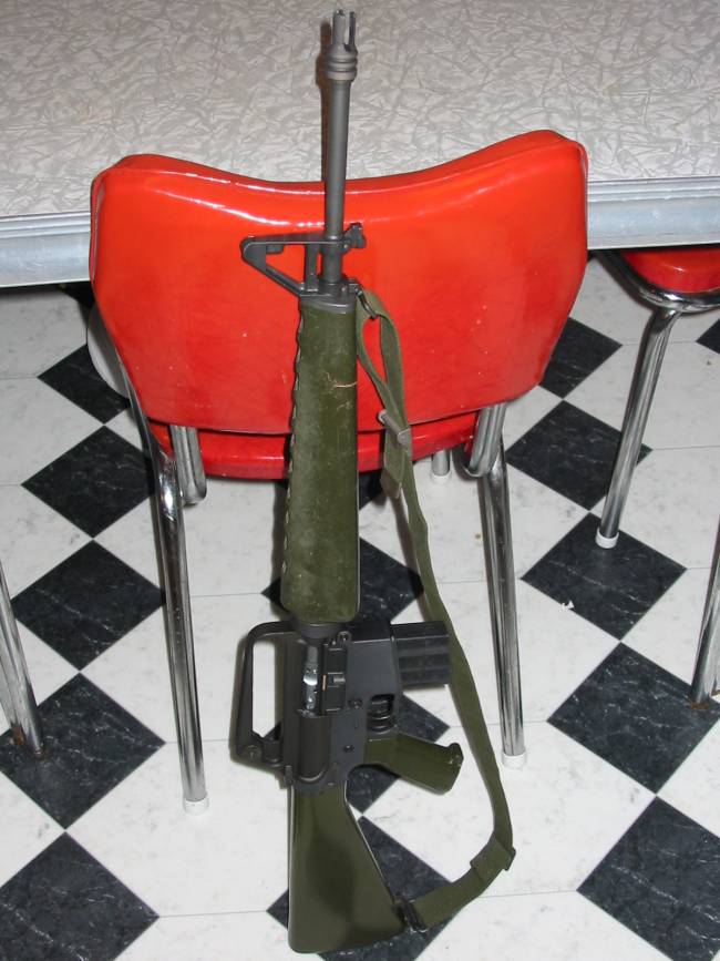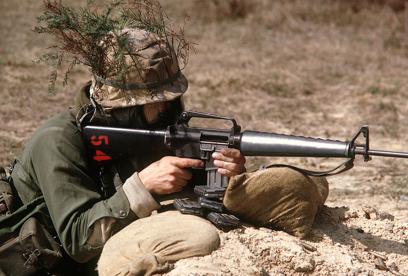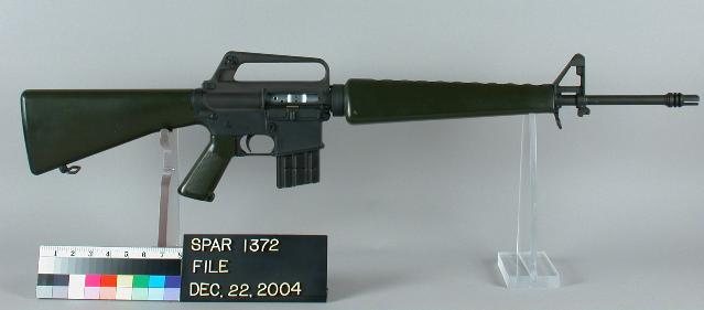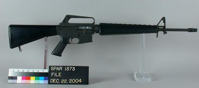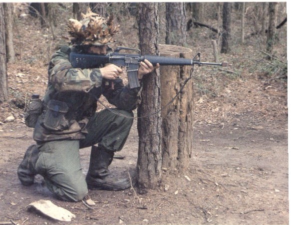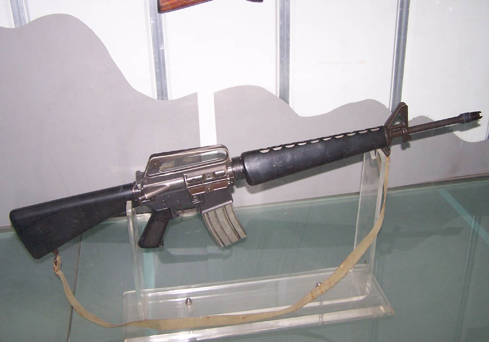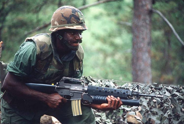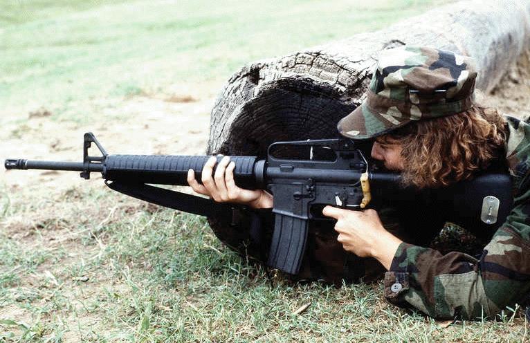 1992年洛杉矶暴动时的照片,这是手持M16A1的国民警卫队,从这个角度看,M16的机匣显得相当单薄,而护木则显得相当粗壮
