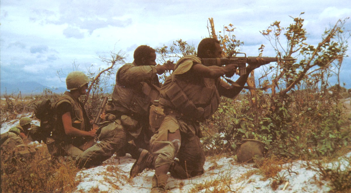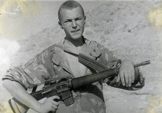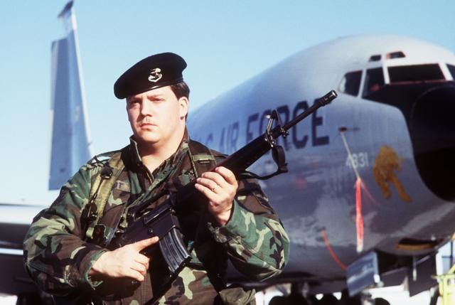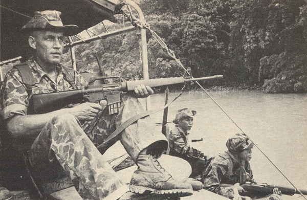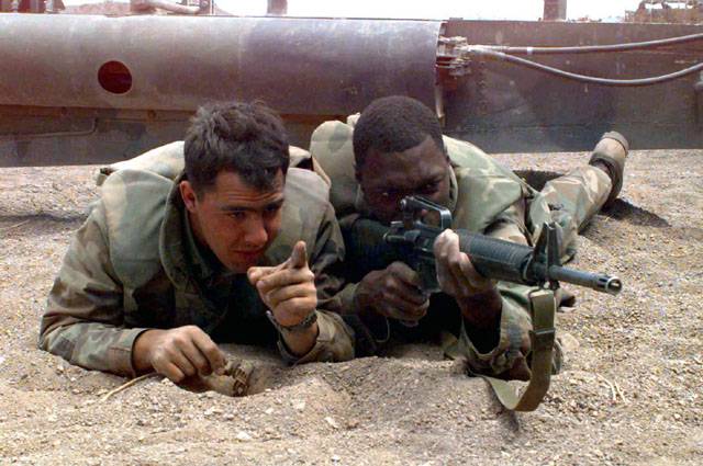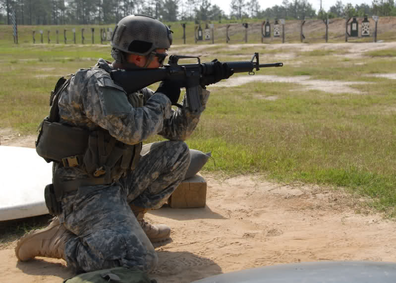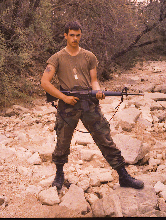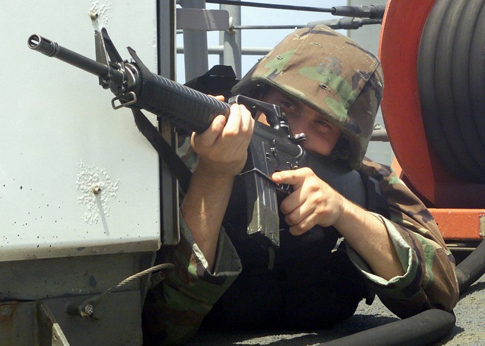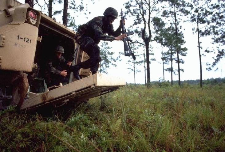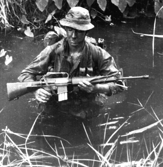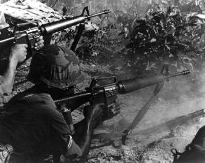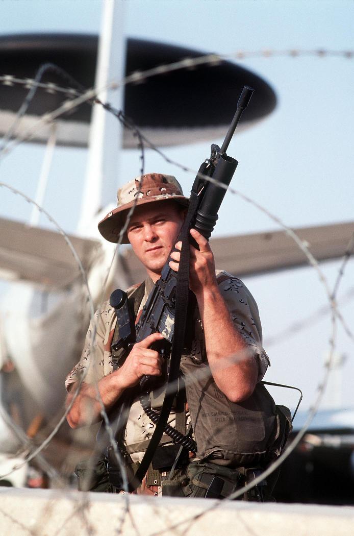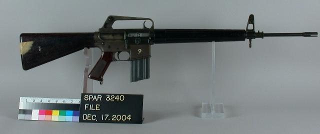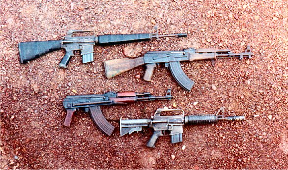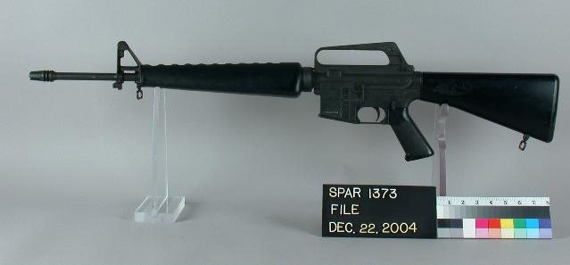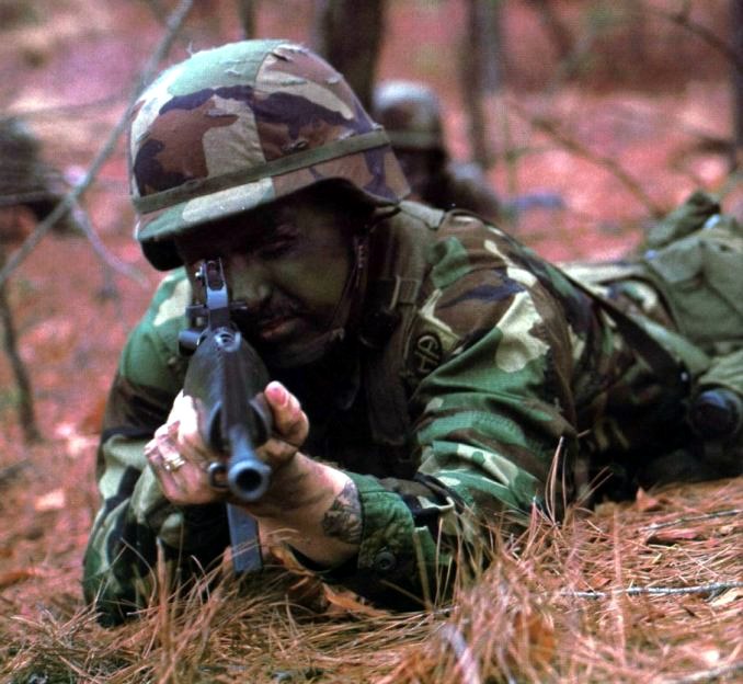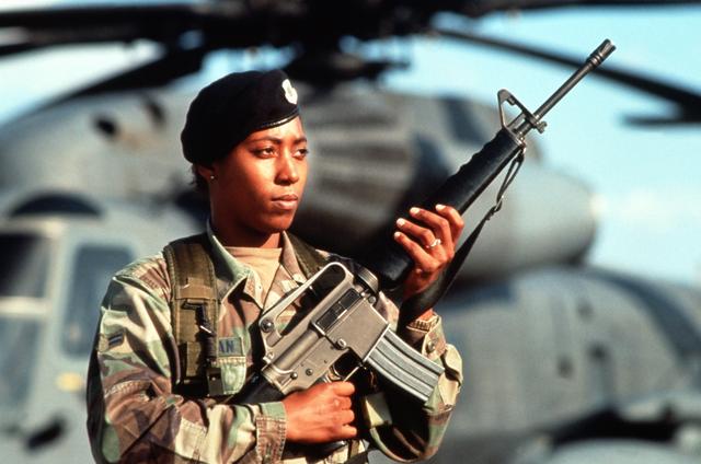1992年洛杉矶暴动时的照片,这是手持M16A1的国民警卫队,从这个角度看,M16的机匣显得相当单薄,而护木则显得相当粗壮
