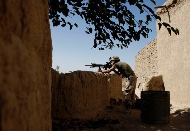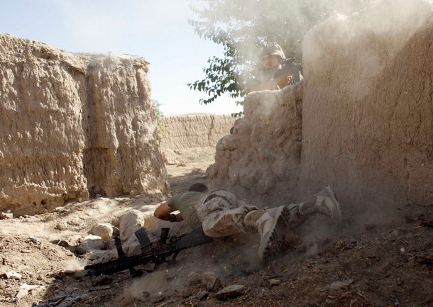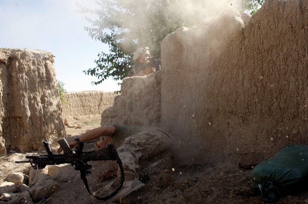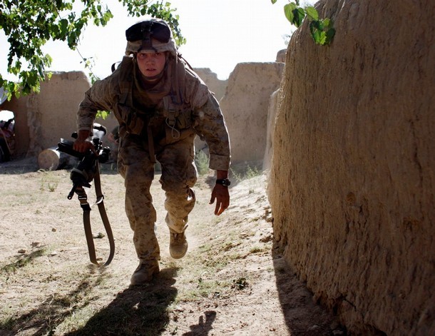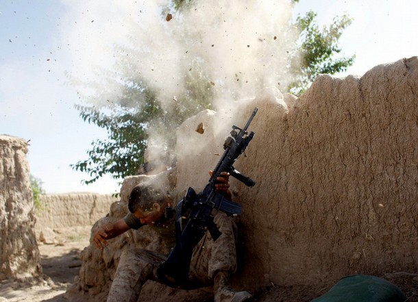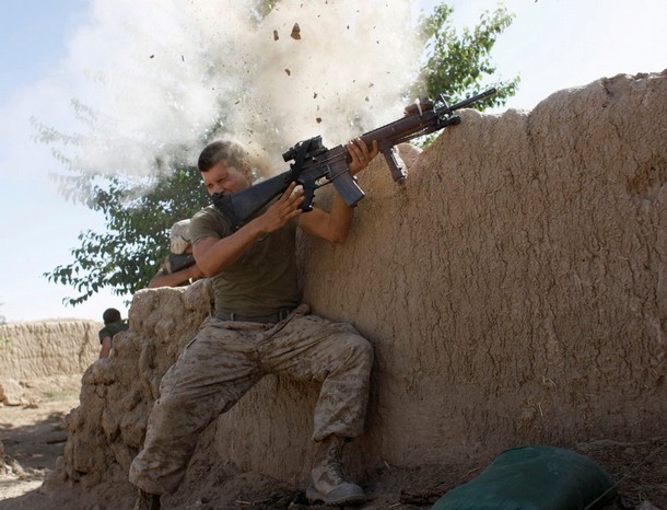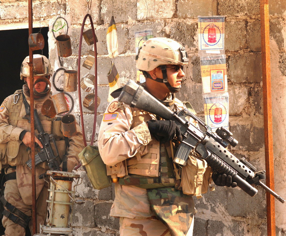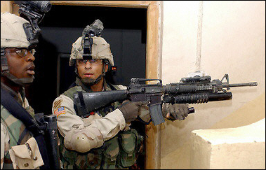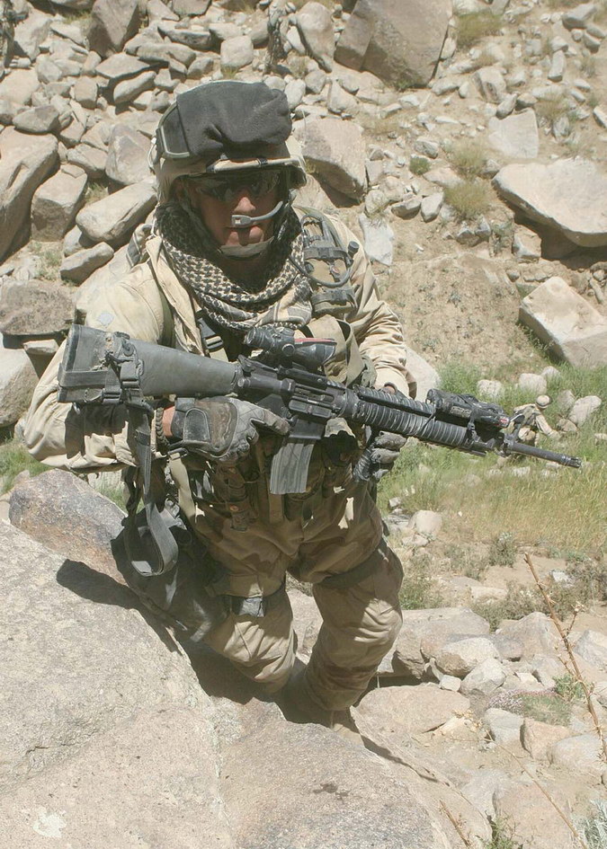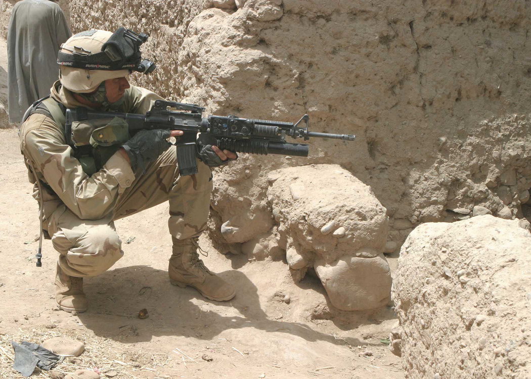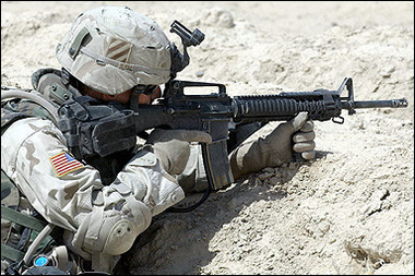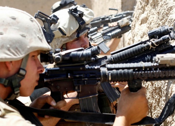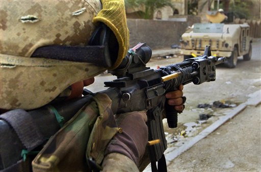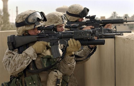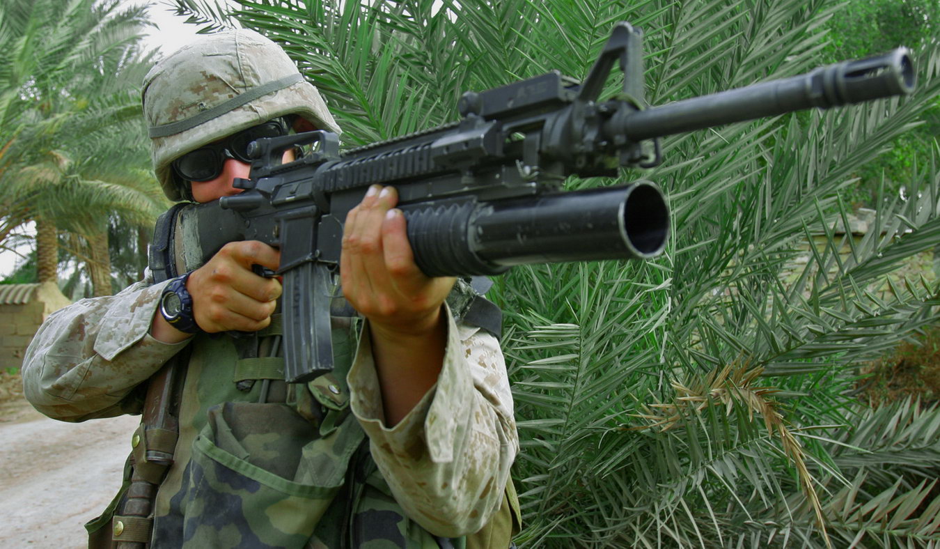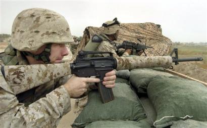 这几个在伊拉克的海军陆战员的M16A4配提把瞄具,他们在枪上做了伪装
