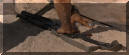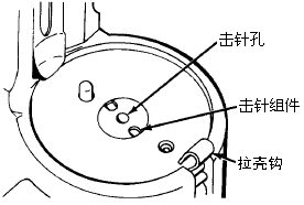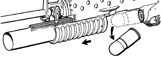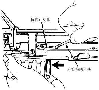 | 拆出榴弹发射器时,先拆出发射枪管,首先要按下枪管锁,把枪管前推至不能推为止,即装填时的打开状态 | 然后用细长物件把滑架上的枪管止动销压下去,再继续推动枪管,就可卸出枪管 |