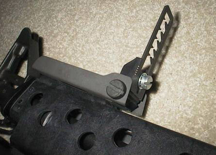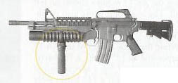 ![]() 由于M203占据了前握把的安装位置,因此有些生产商又生产了可以装在M203下面的前握把 |