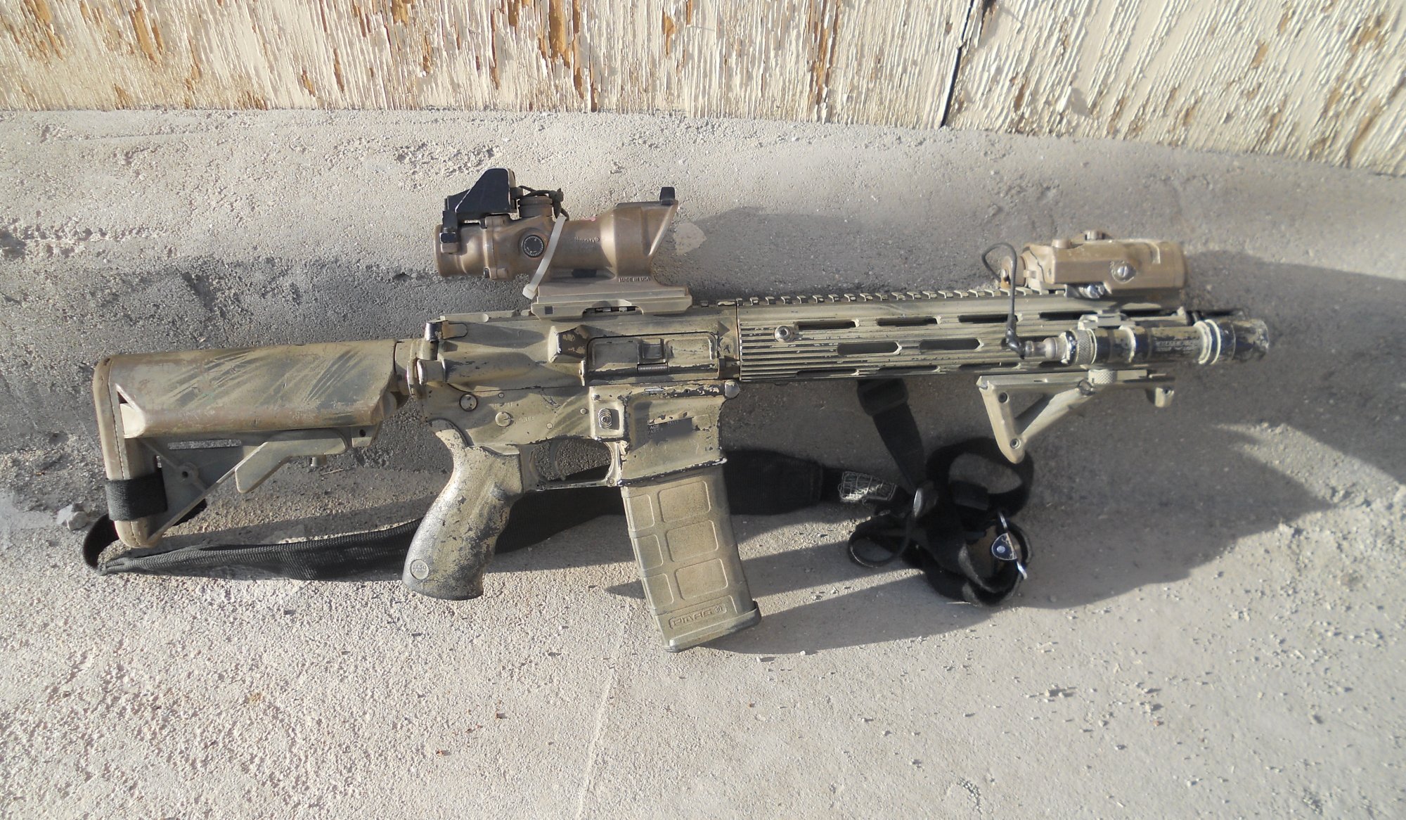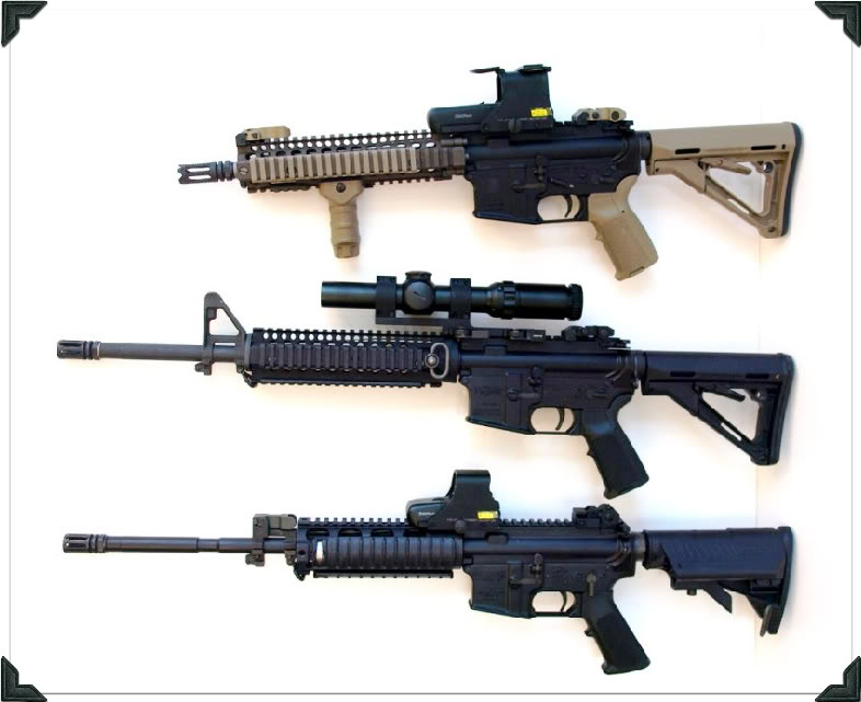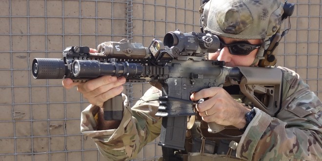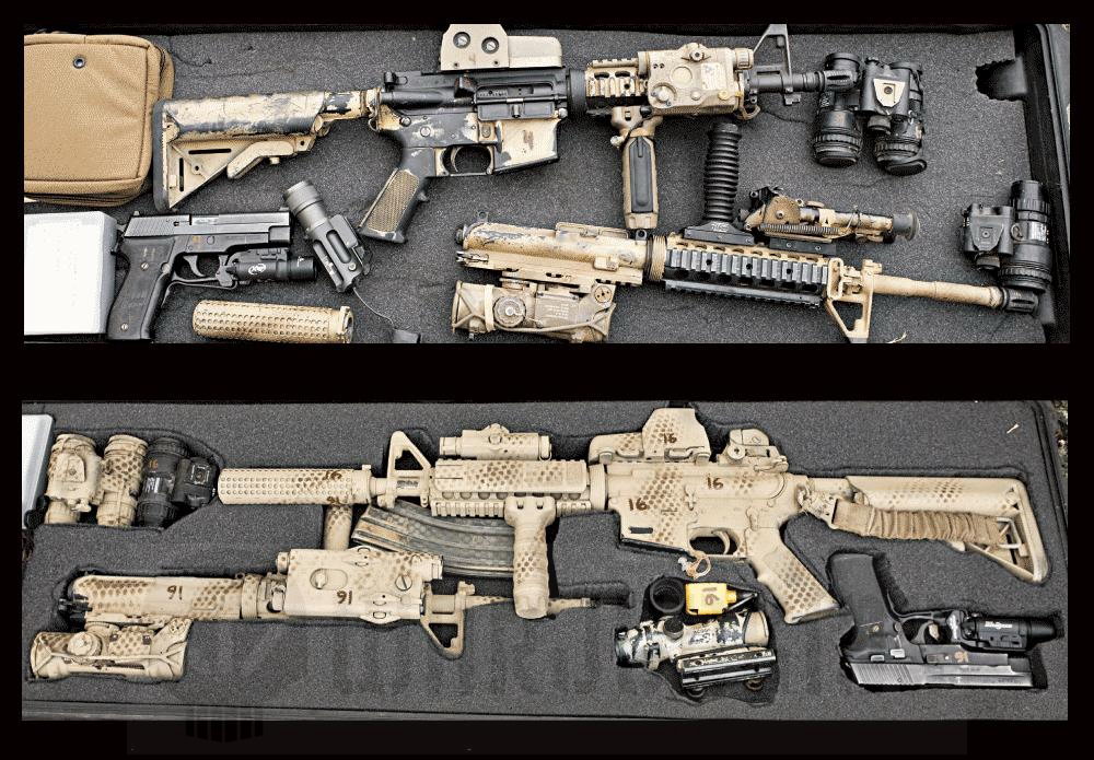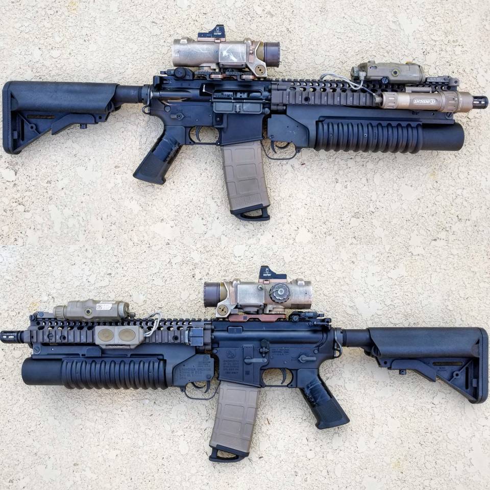 陆军特种部队(绿色贝雷帽)所使用的自己改装过的“短上机匣M4A1”,左图是TROY-VTAC Alpha护木,右图是TROY Alpha护木