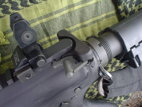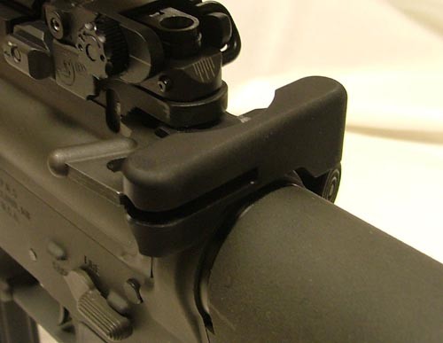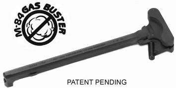 拉机柄:采用PRI公司的M84 Gas Buster拉机柄,这种拉机柄放大了拉机柄锁的尺寸,但最主要的作用是起到气体偏流的作用。因为AR系统有一个先天性的缺点,当使用消声器进行射击时,会有火药气体从拉机柄槽处溢出而打向射手的面部。于是有一些厂家生产了可以使这些气体偏流的替换产品,PRI M84 Gas Buster拉机柄是其中之一。