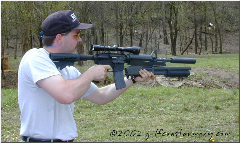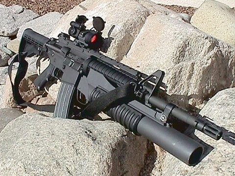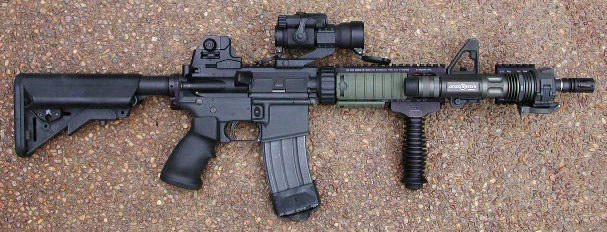 M4/M4A1加挂M203PI榴弹发射器的方式与M16A2一样,但没有专用护木。