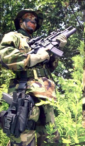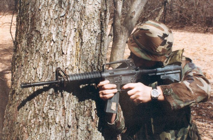 ![]() 这是海军陆战队的平顶机匣M4与M16A2,这张图可以看出M4消焰器与M16A2消焰器一样,取消了下面的两个开孔 |