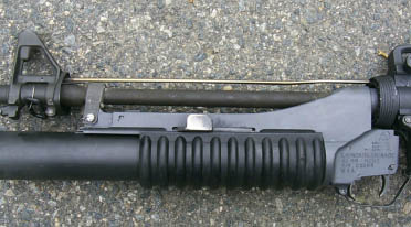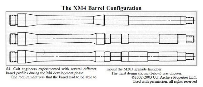 M4/M4A1的枪管外形为三段式,枪管前端切削出的一小段缩颈是用以固定M203安装轨的前部。
